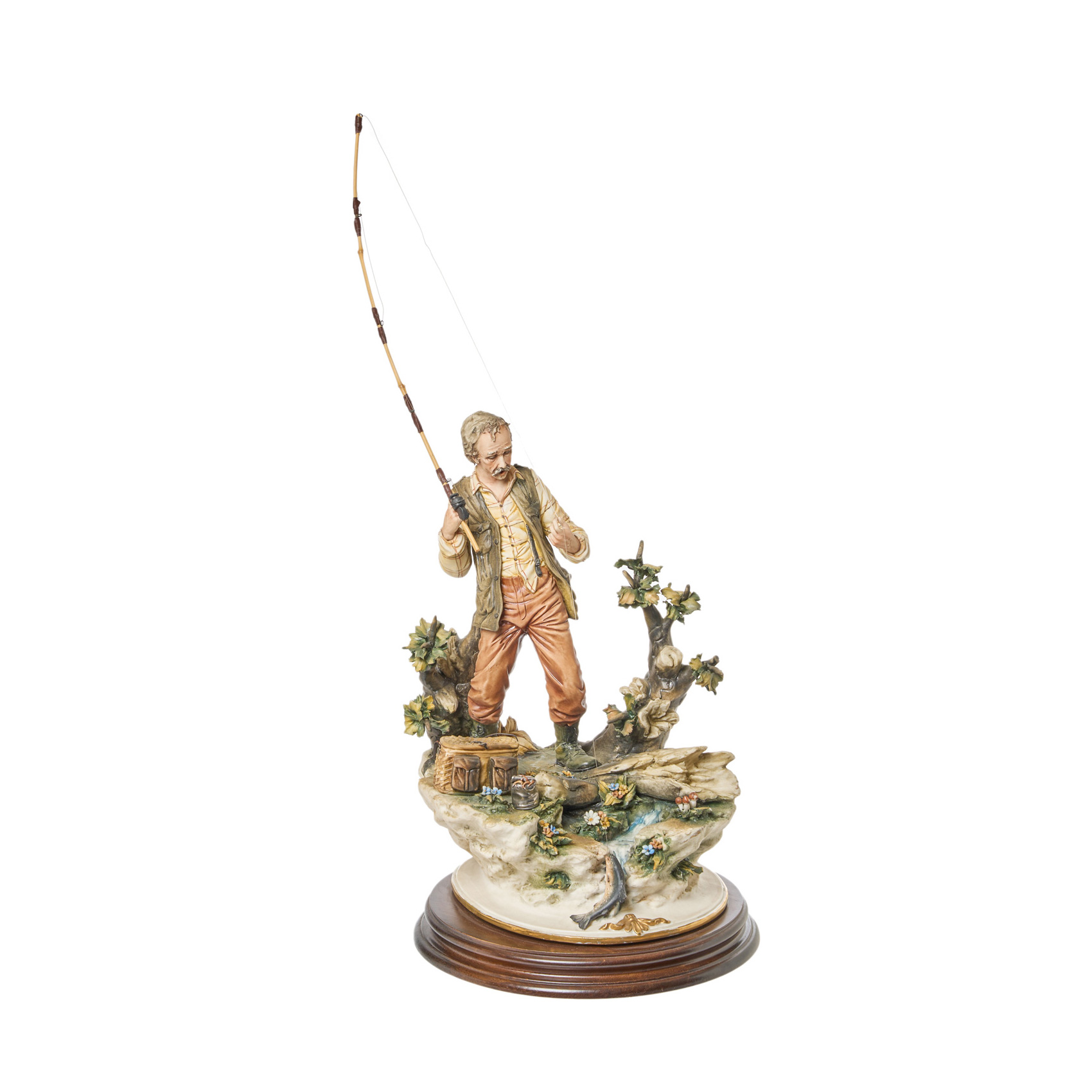 Il Pescatore. Grupo en porcelana italiana Capodimonte esmaltada con representación de escena de pesca, s.XX. Marcas esmaltadas al dorso y firmado H. Giorgitore. Apoya sobre peana en madera.