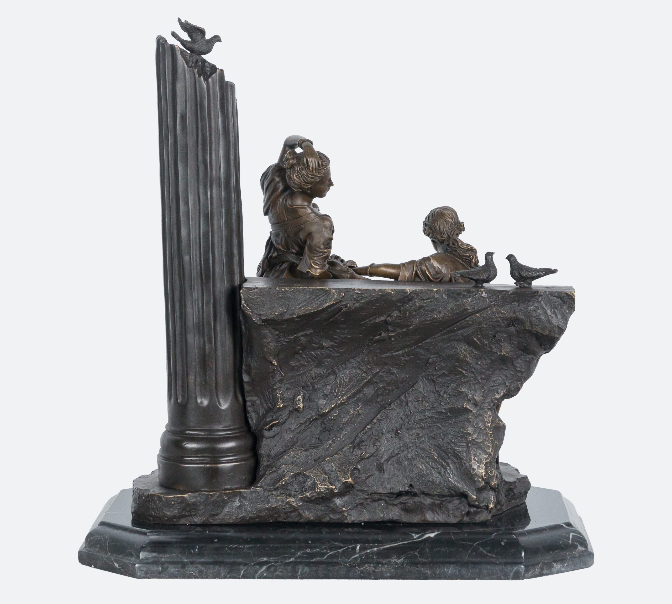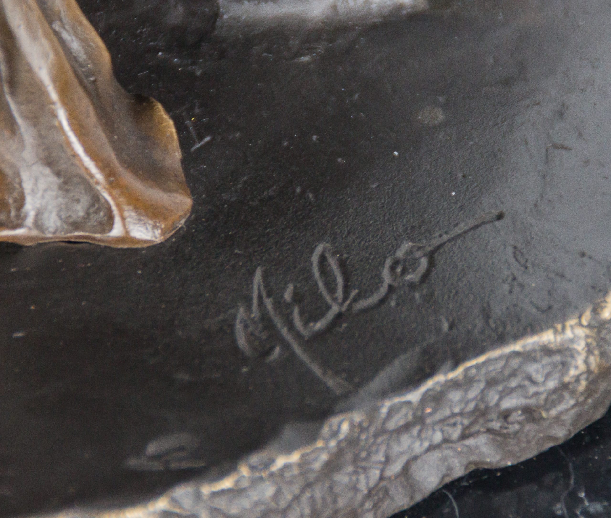 Escultura en bronce patinado sobre peana en mármol negro veteado. Firmada.