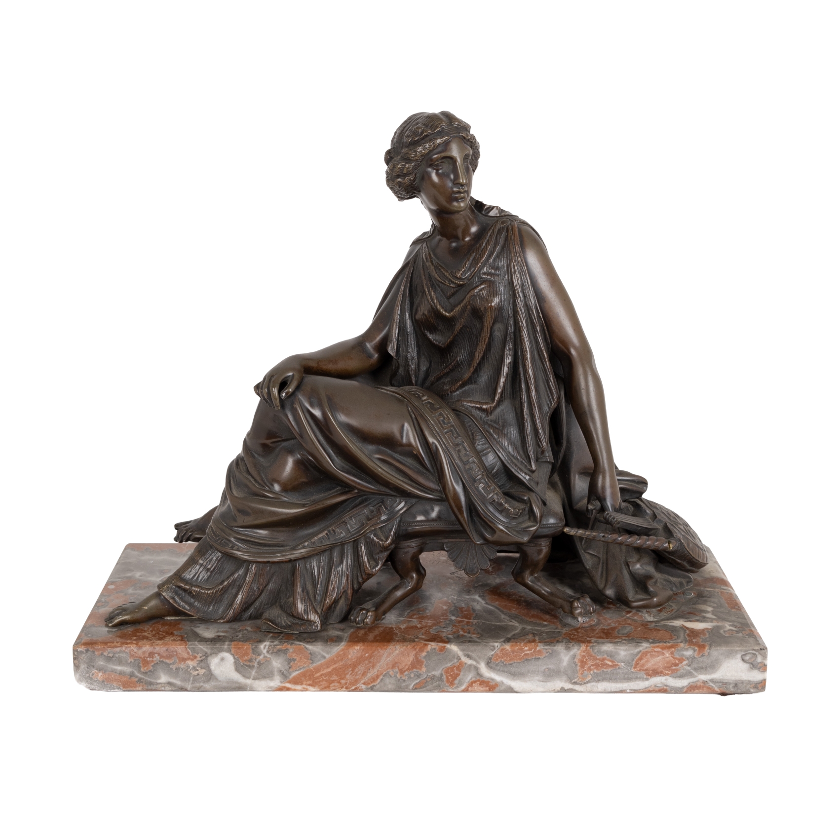 Escultura en bronce patinado sobre peana en mármol rojo veteado.
