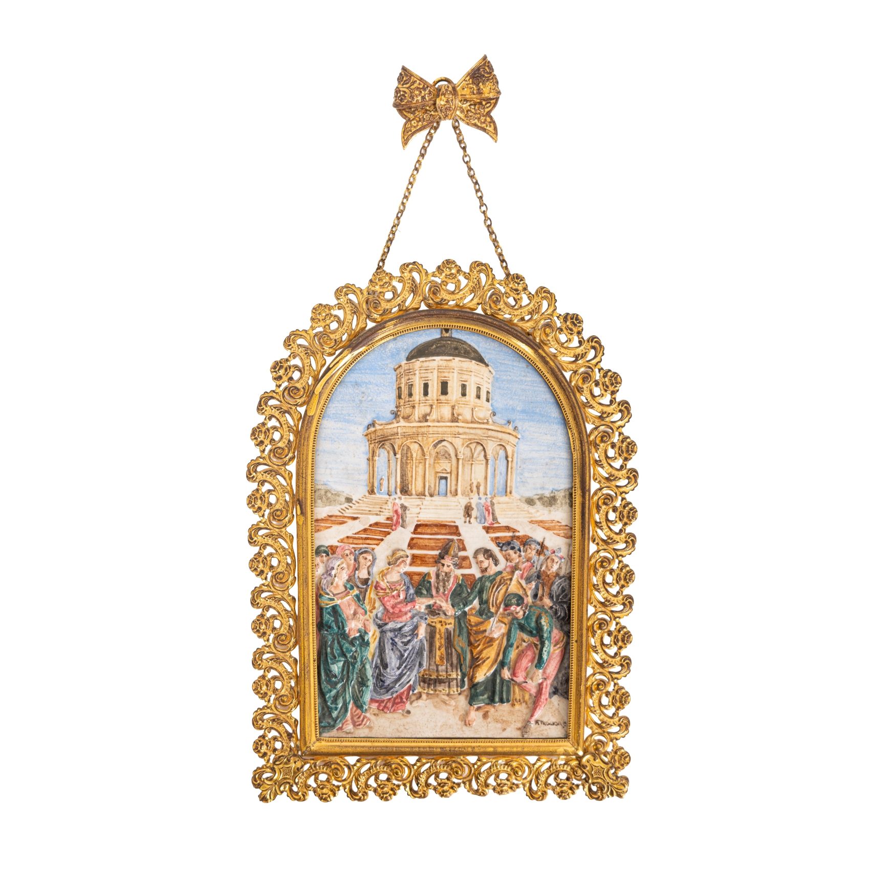 Placa en porcelana italiana de estilo Capodimonte con representación esmaltada de «Los Desposorios de la Virgen» de Raffaello Sanzio (Urbino, Italia, 1483-Roma, Italia, 1520). Firmada F. Migliore. Enmarcada en metal dorado.