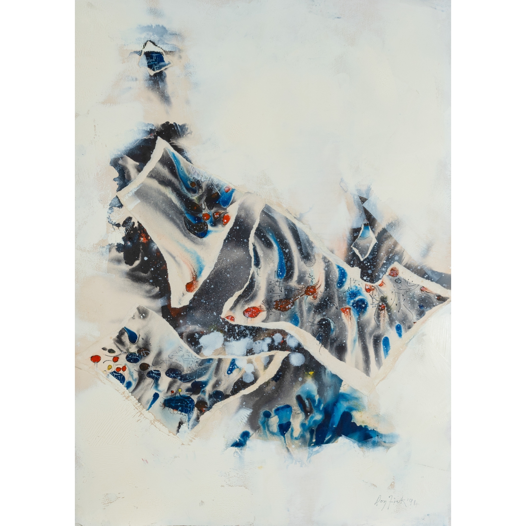 Técnica mixta, acuarela y collage sobre papel de alto gramaje. Firmado y fechado en 1994.