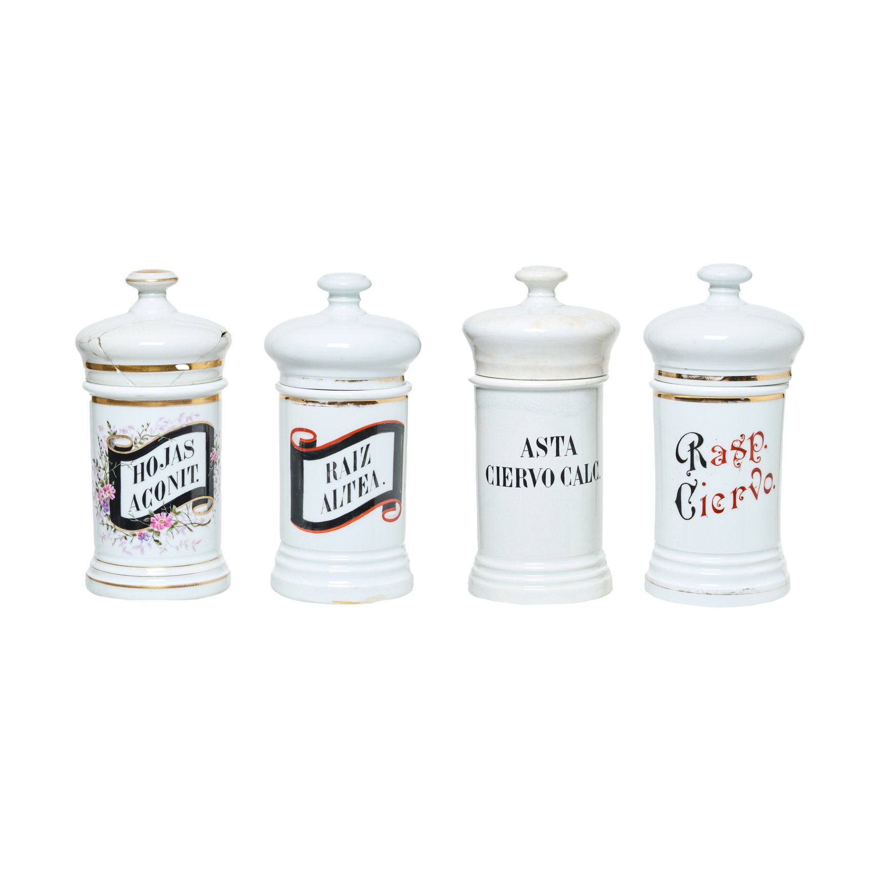 Lote de cuatro albarelos de farmacia en cerámica esmaltada, ppios. del s.XX. Uno presenta sello en la base de la Manufactura Pickman, Sevilla.