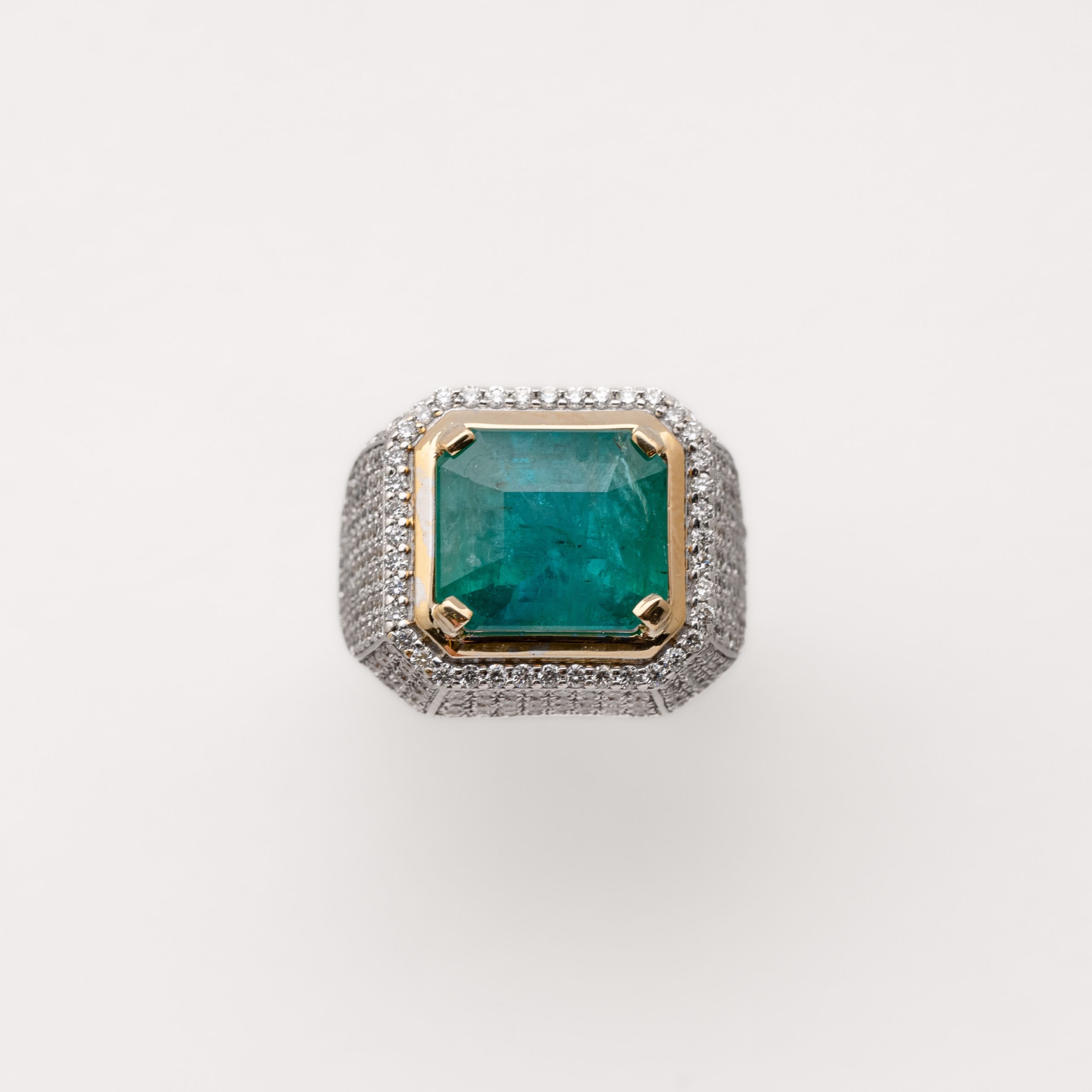 Sortija sello en oro bicolor con esmeralda colombiana talla octogonal y cuerpo de pavé de diamantes talla brillante.