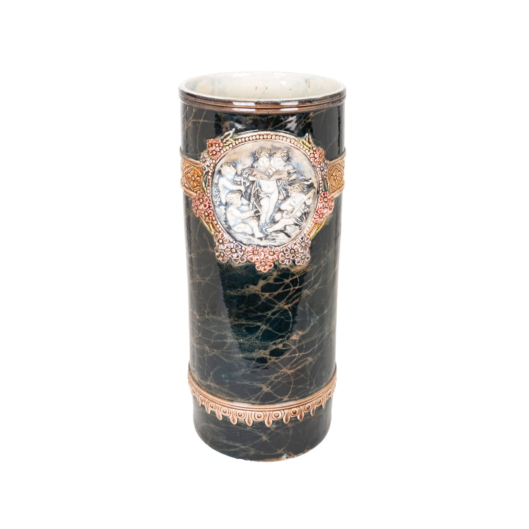 Paragüero en cerámica esmaltada y marmoleada con decoración de medallones con representación de ángeles músicos, s.XX.