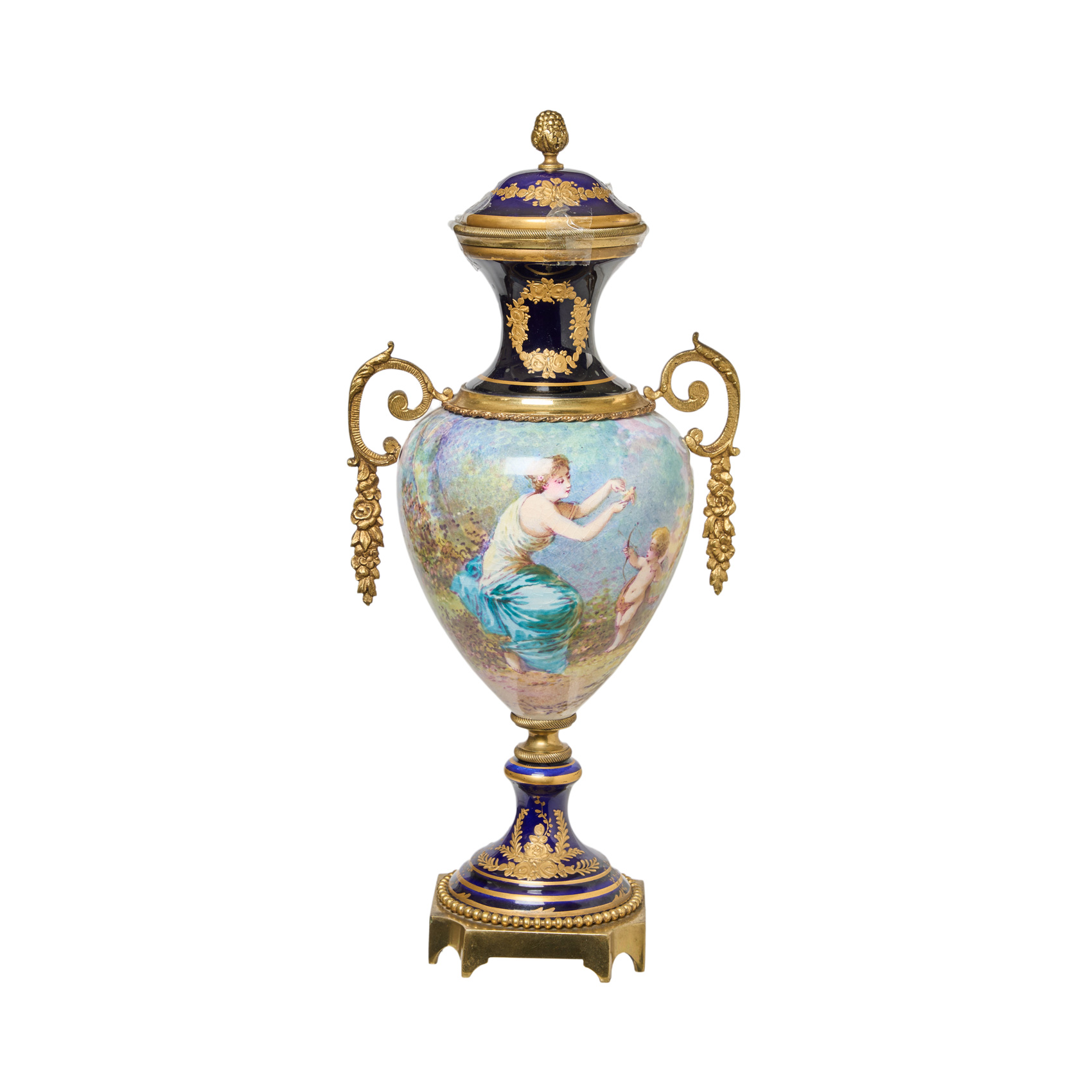 Jarrón con tapa en porcelana francesa de Sèvres con representación de Cupido y Venus con paisaje bucólico en cuerpo y base y cuello en azul cobalto con realces en dorado y aplicaciones en bronce, fles. del s.XIX-ppios. del s.XX. Presenta sello en la tapa.