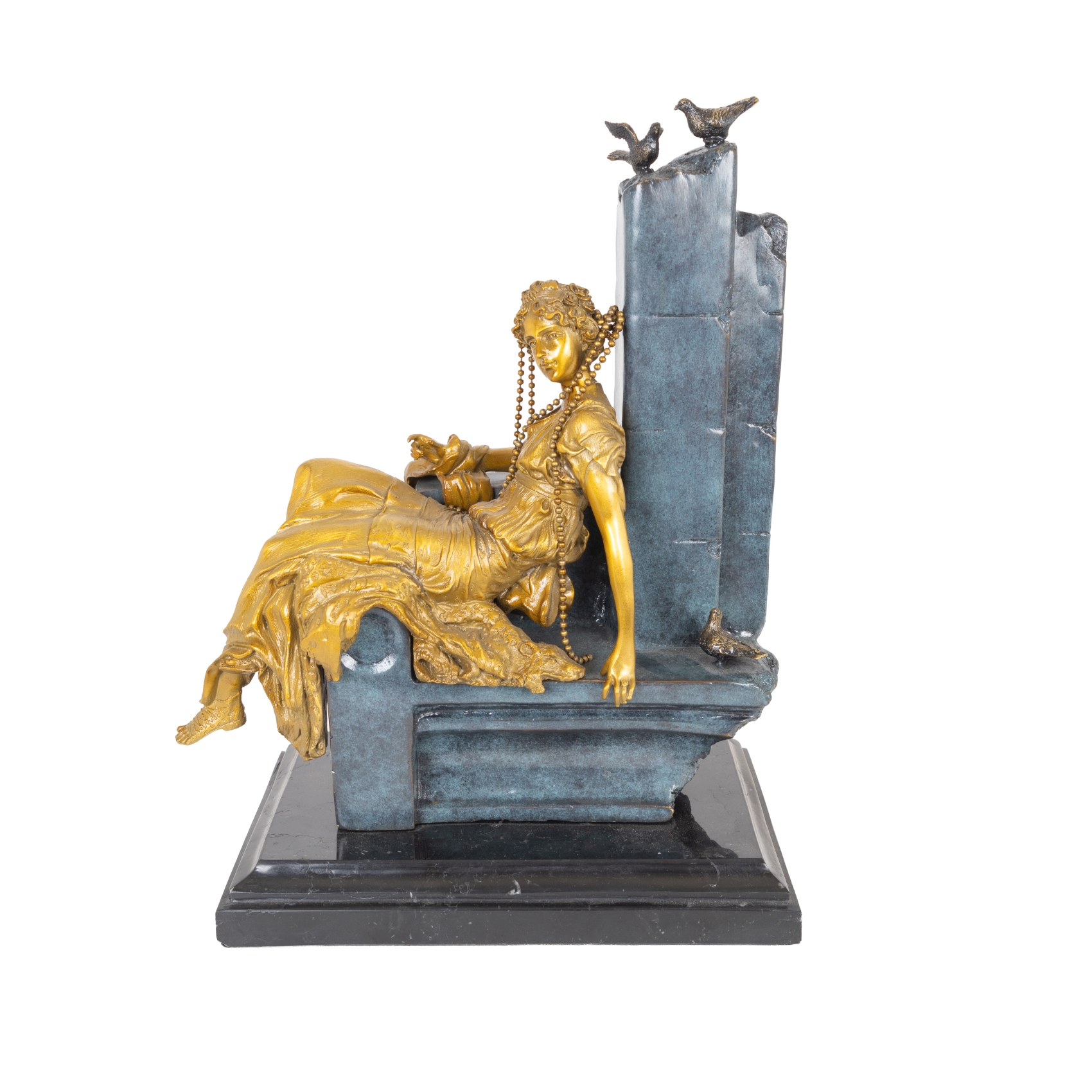 Escultura en bronce dorado y patinado sobre peana en mármol negro veteado. Firmada.