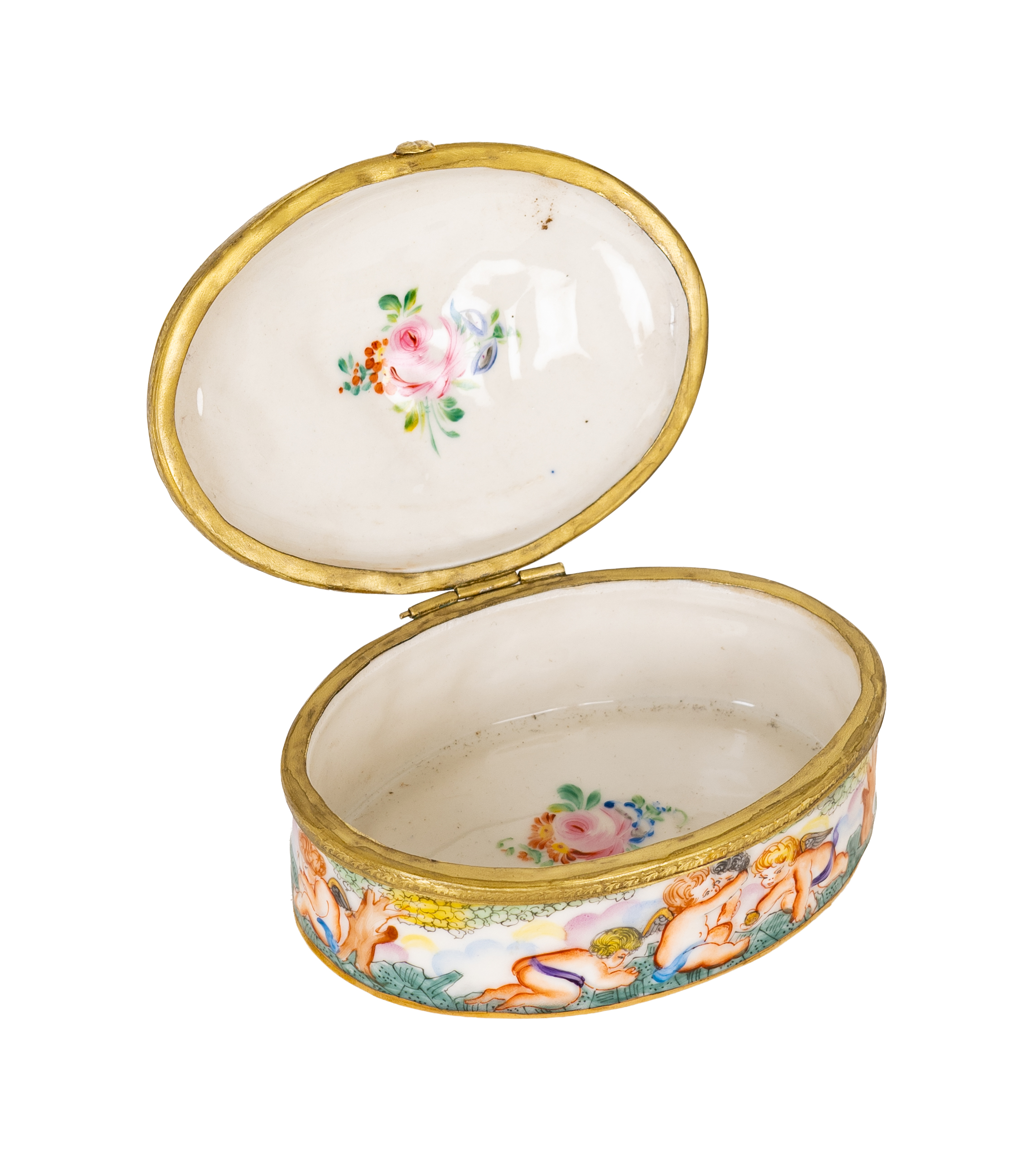 Caja en porcelana italiana esmaltada de estilo Capodimonte con decoraciones de infantes y angelotes, c.1950. Montura perimetral en metal dorado.