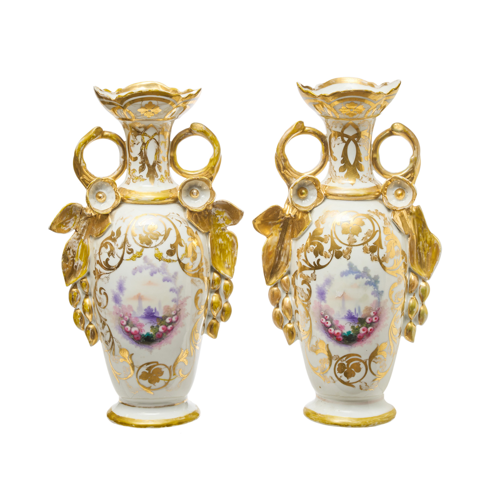 Pareja de jarrones isabelinos en porcelana esmaltada con decoraciones florales en relieve, motivos paisajísticos esmaltados y ribeteados al oro fino, s.XIX.