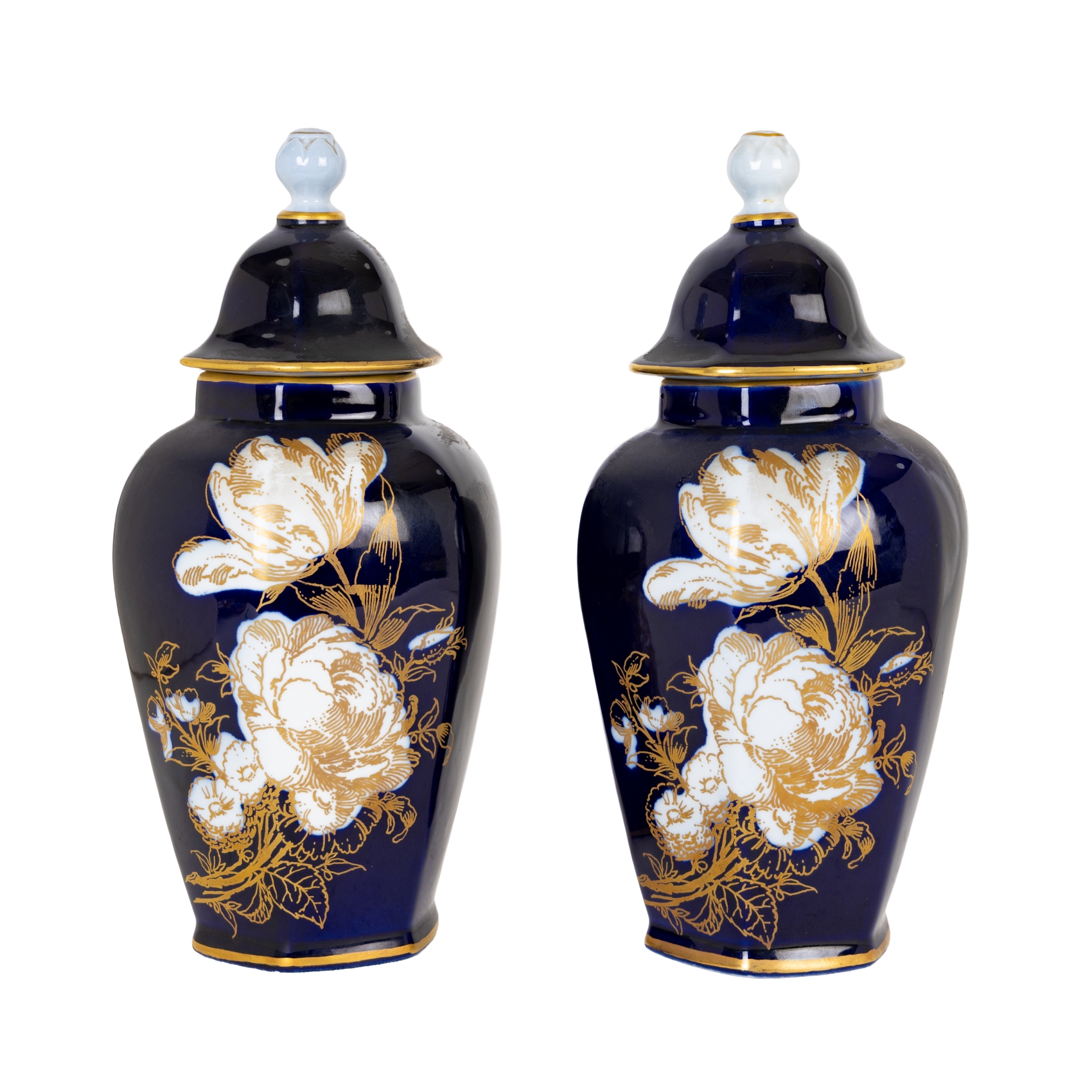 Pareja de jarrones con tapa en porcelana de Manises de la Manufactura Hispania con decoración esmaltada de motivos florales sobre fondo azul cobalto con fileteados al oro fino, mediados del s.XX. Marcas en la base.