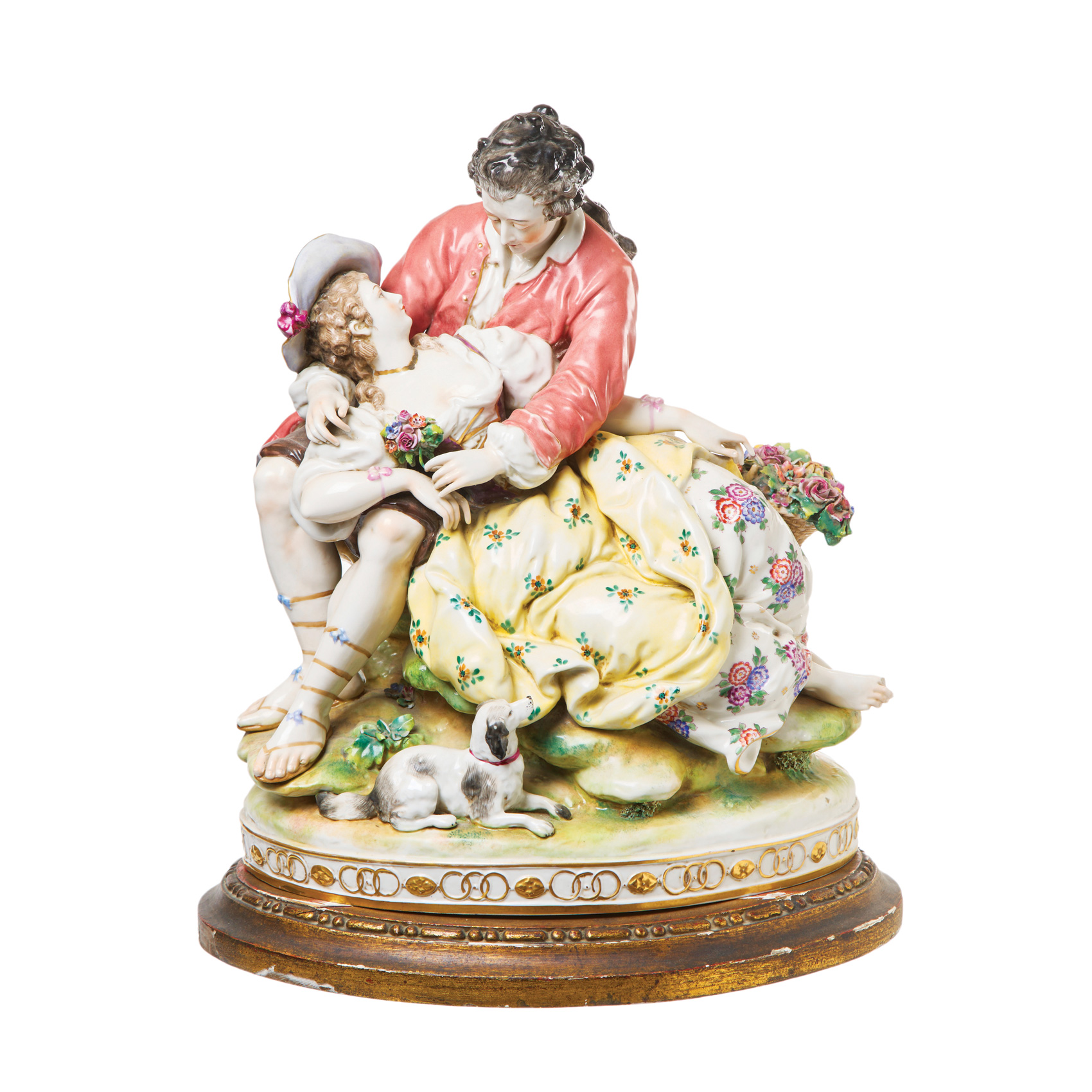 Escena galante. Grupo en porcelana catalana esmaltada sobre peana en madera dorada, s.XX. Presenta etiqueta de origen en la base.