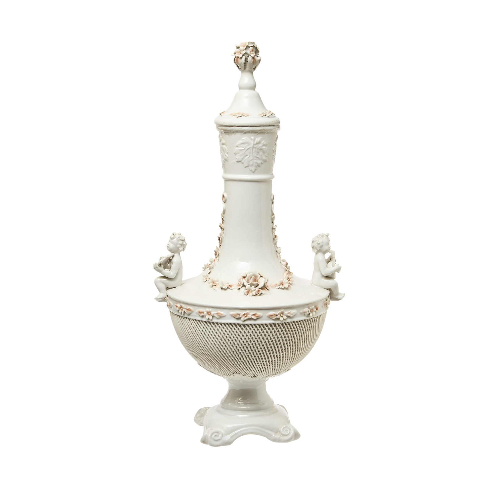 Centro jarrón con tapa en cerámica italiana parcialmente esmaltada en tonalidad rosada con decoraciones de aplicaciones florales y de infantes músicos, mediados del s.XX. Marcas en la base.
