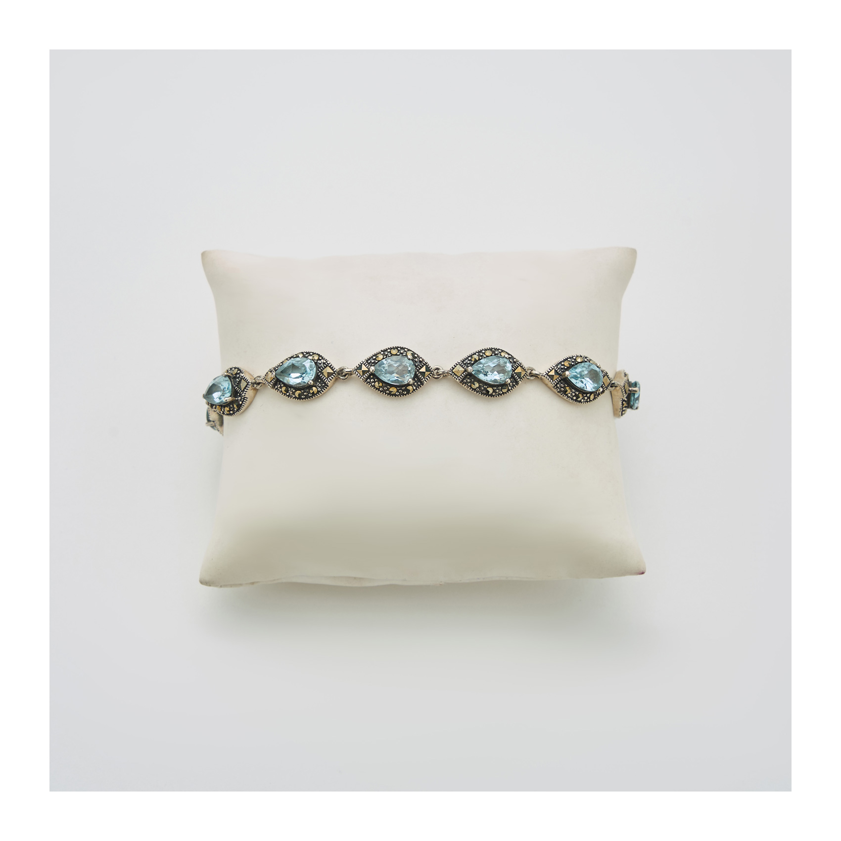 Pulsera en plata con motivos ojivales de símil de agua marina talla perilla de 9 x 6 mm. y marquesitas.
