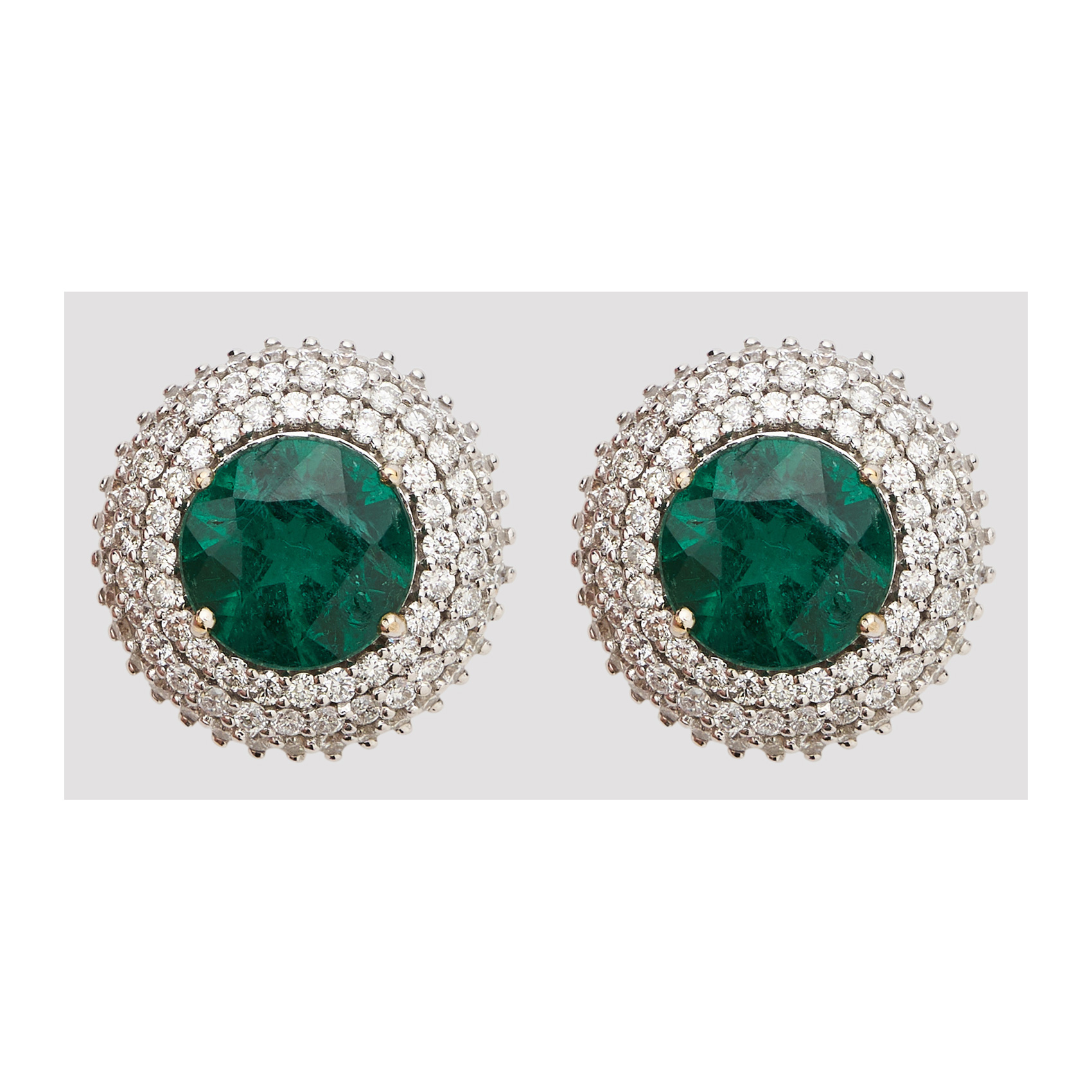 Pendientes circulares en oro blanco con esmeralda central talla redonda y tres orlas de diamantes talla brillante.
