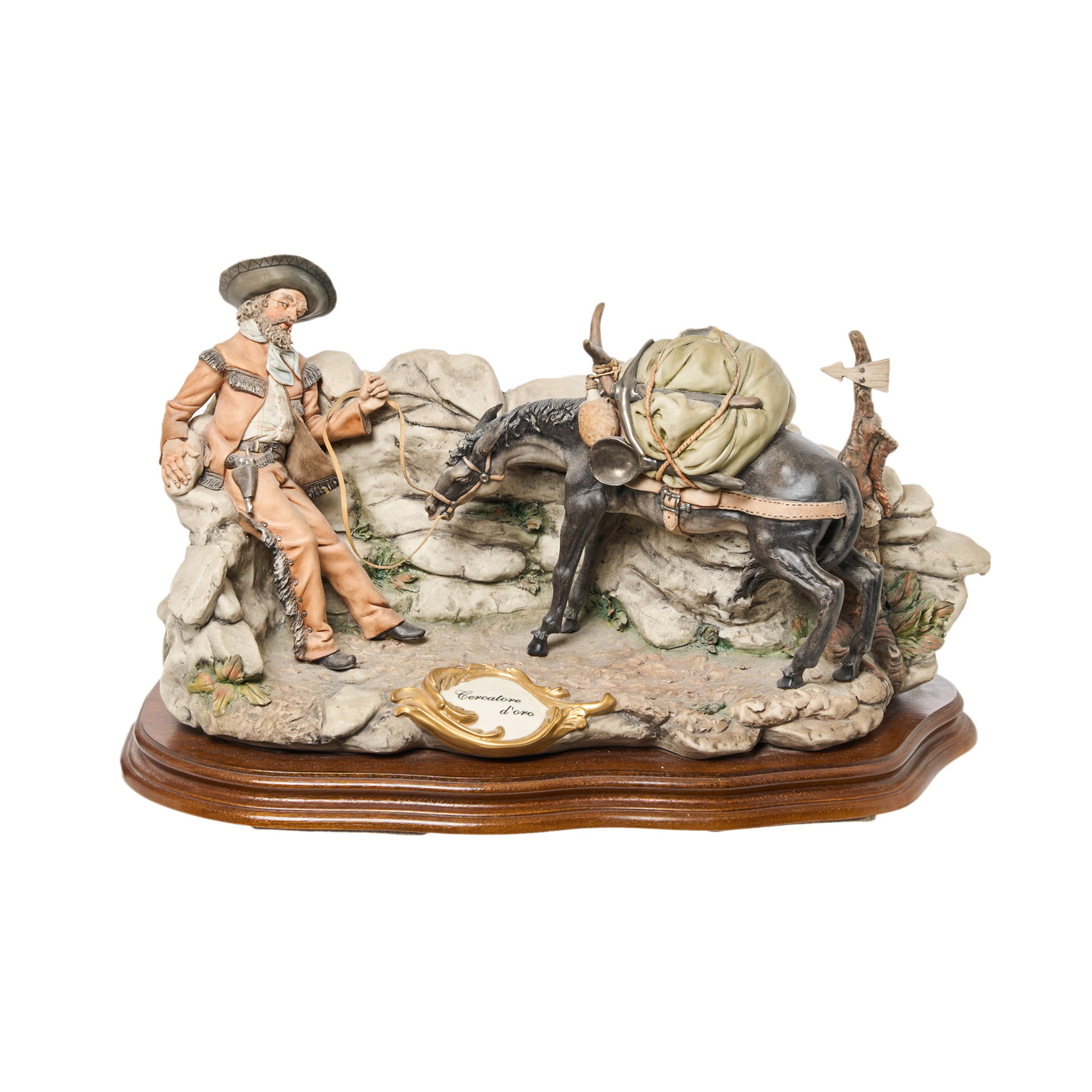 Cercatore d’Oro. Grupo en porcelana italiana Capodimonte esmaltada con representación de escena del oeste con asno, s.XX. Titulado. Marcas esmaltadas al dorso y firmado Volta. Apoya sobre peana en madera.