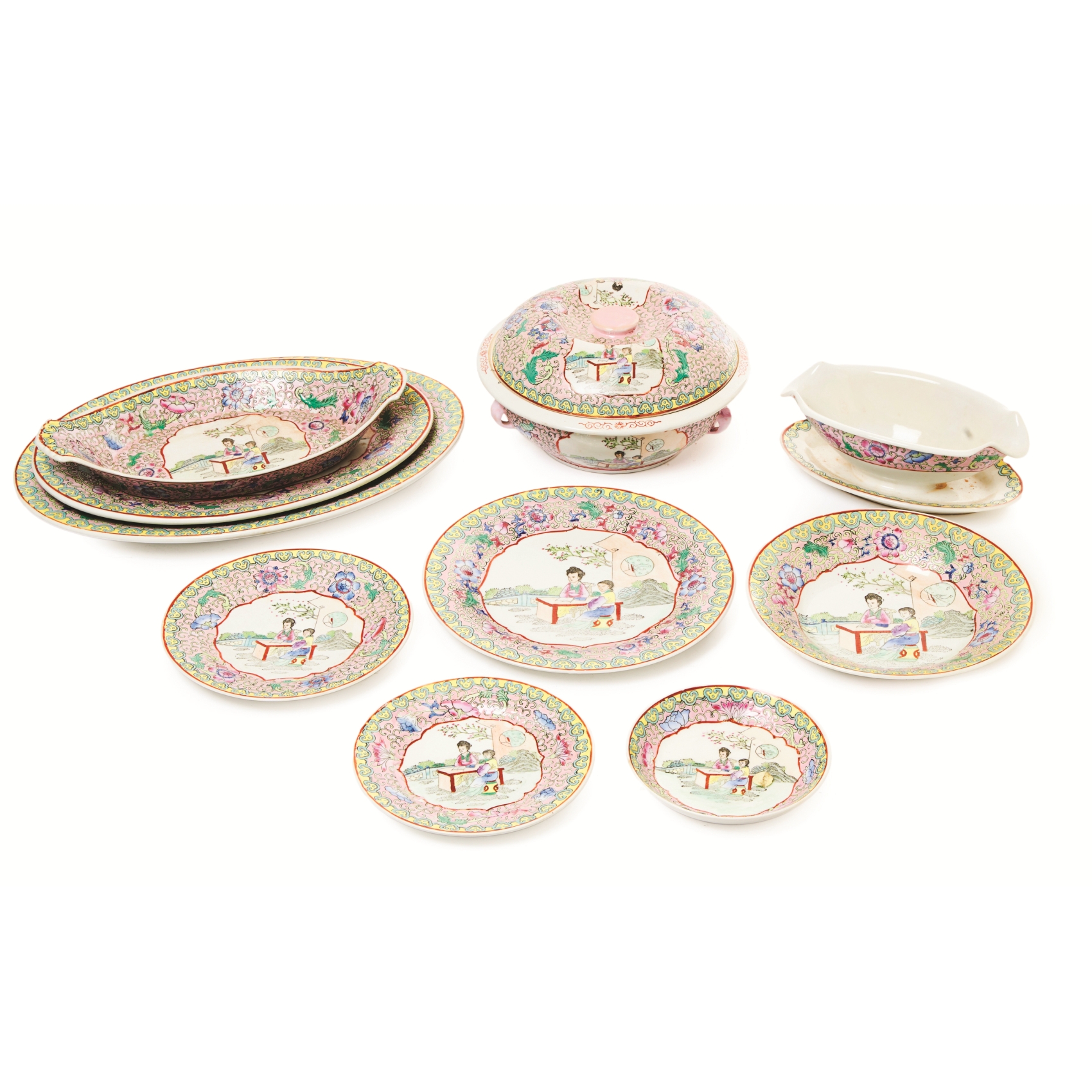Vajilla decorativa en porcelana china Familia Rosa con decoración esmaltada de motivos florales y de personajes, s.XX. 63 piezas. Compuesta por una sopera, una salsera, una fuente, dos bandejas, doce platos trinchantes, doce platos soperos, once platos de ensalada, doce platos de tarta y once platos de postre.