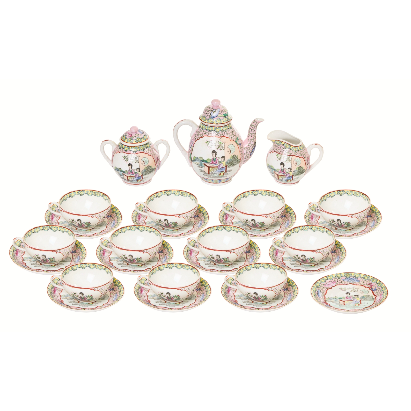 Juego de café de 26 piezas decorativo en porcelana china Familia Rosa con decoración de motivos florales y de personajes, s.XX. Compuesto por una cafetera, una lechera, una azucarera, once tazas y doce platos.
