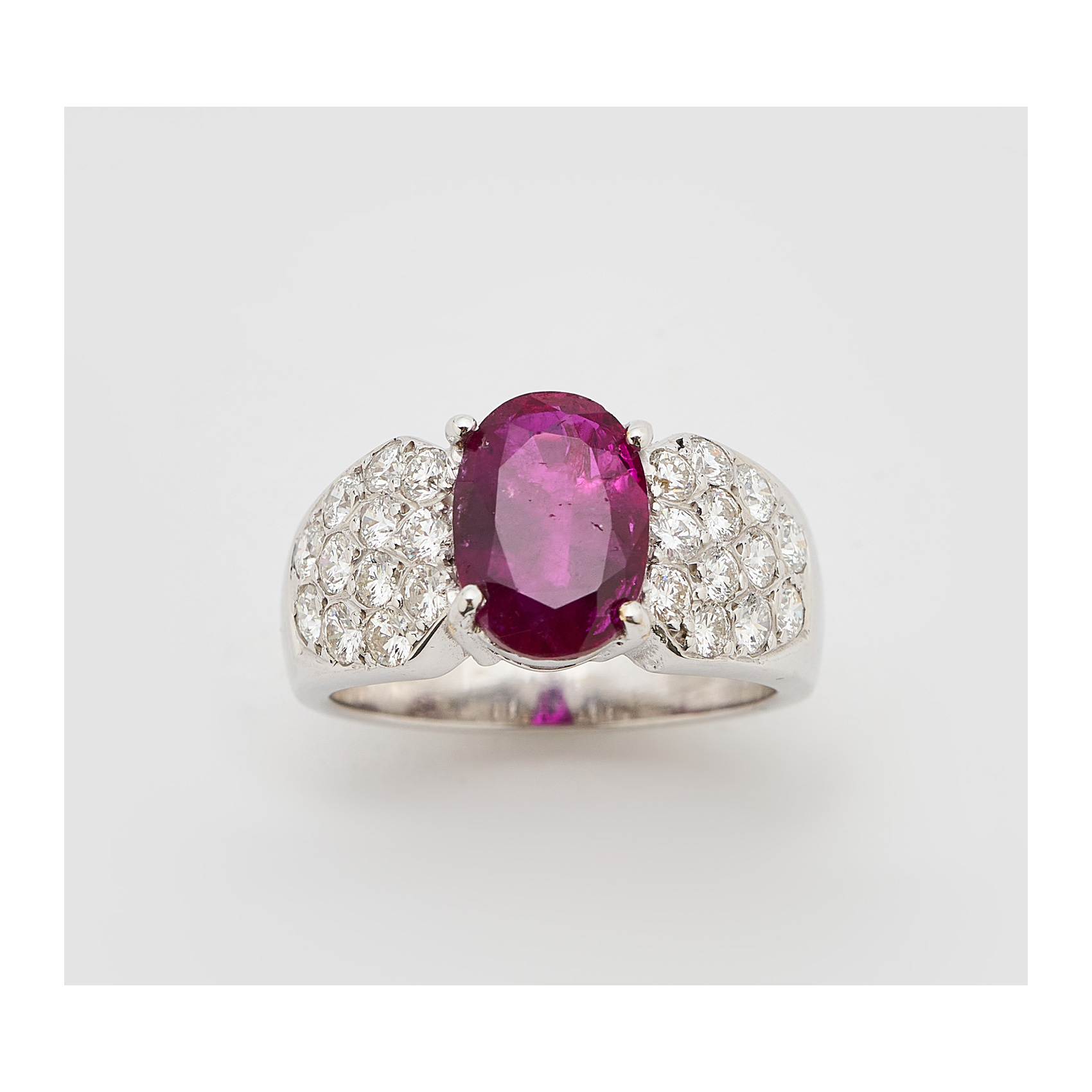 Sortija en oro blanco con rubí de Myanmar( Burma ) talla oval, color: Pinkish Red custodiado por diamantes talla brillante.