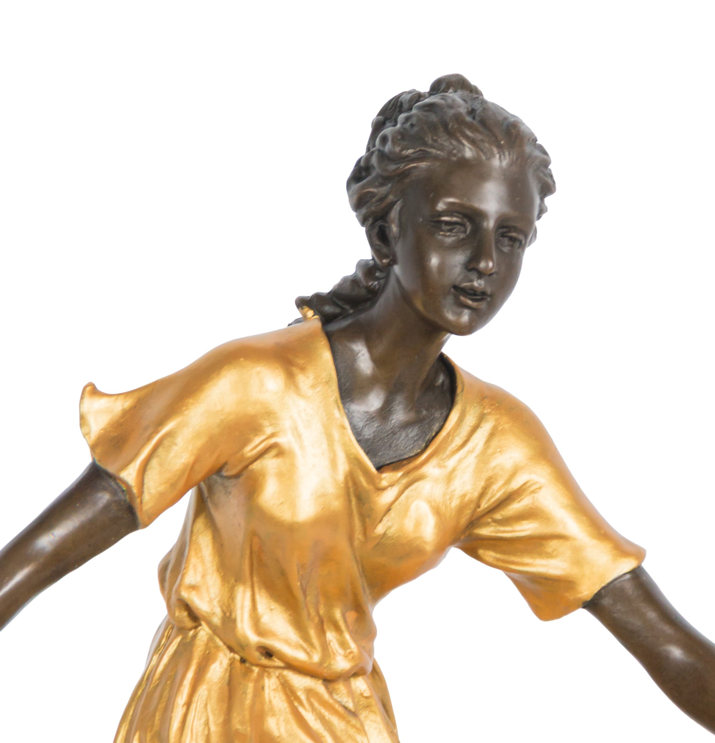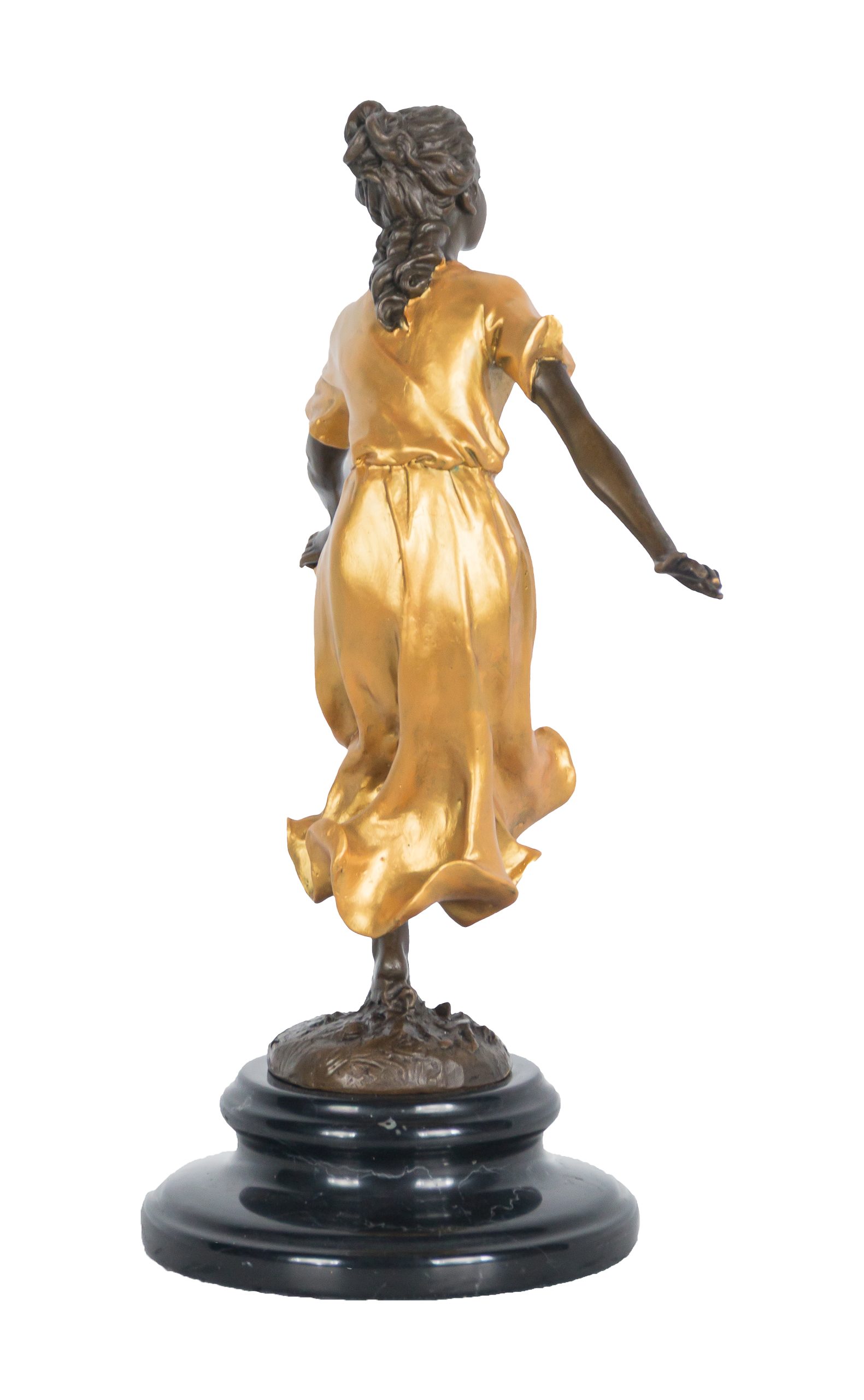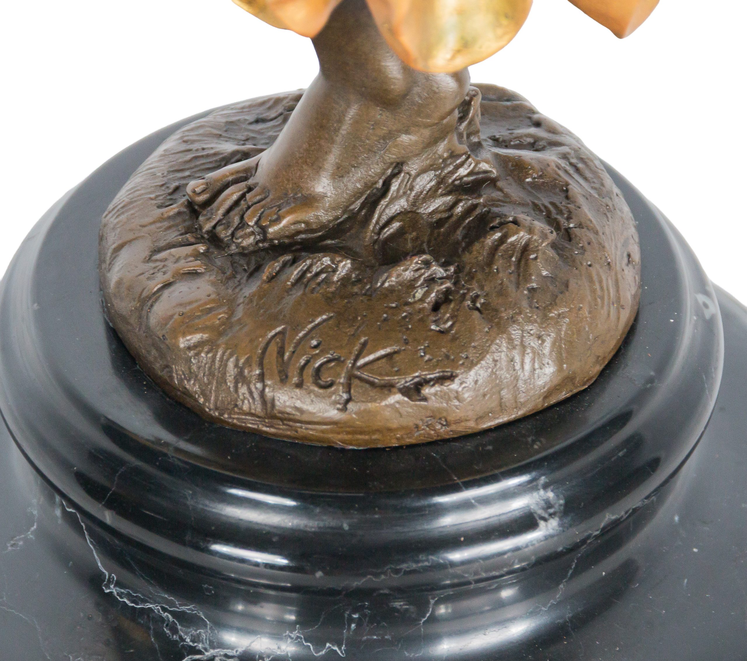 Escultura en bronce patinado y parcilamente dorado sobre peana en mármol negro. Firmada Nick.