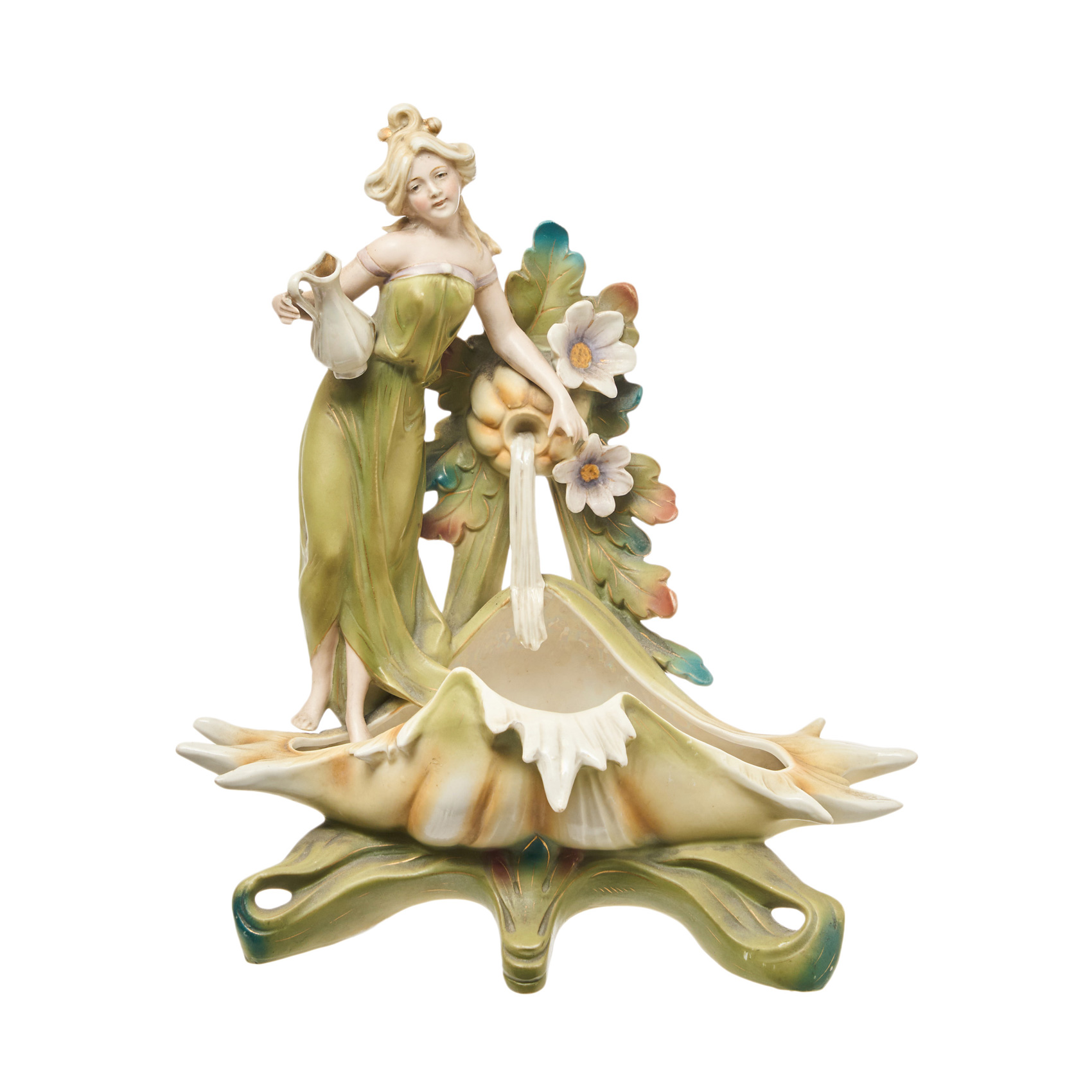 Centro Modernista en biscuit esmaltado con decoración de ninfa en la fuente con flores, ppios. del s.XX.