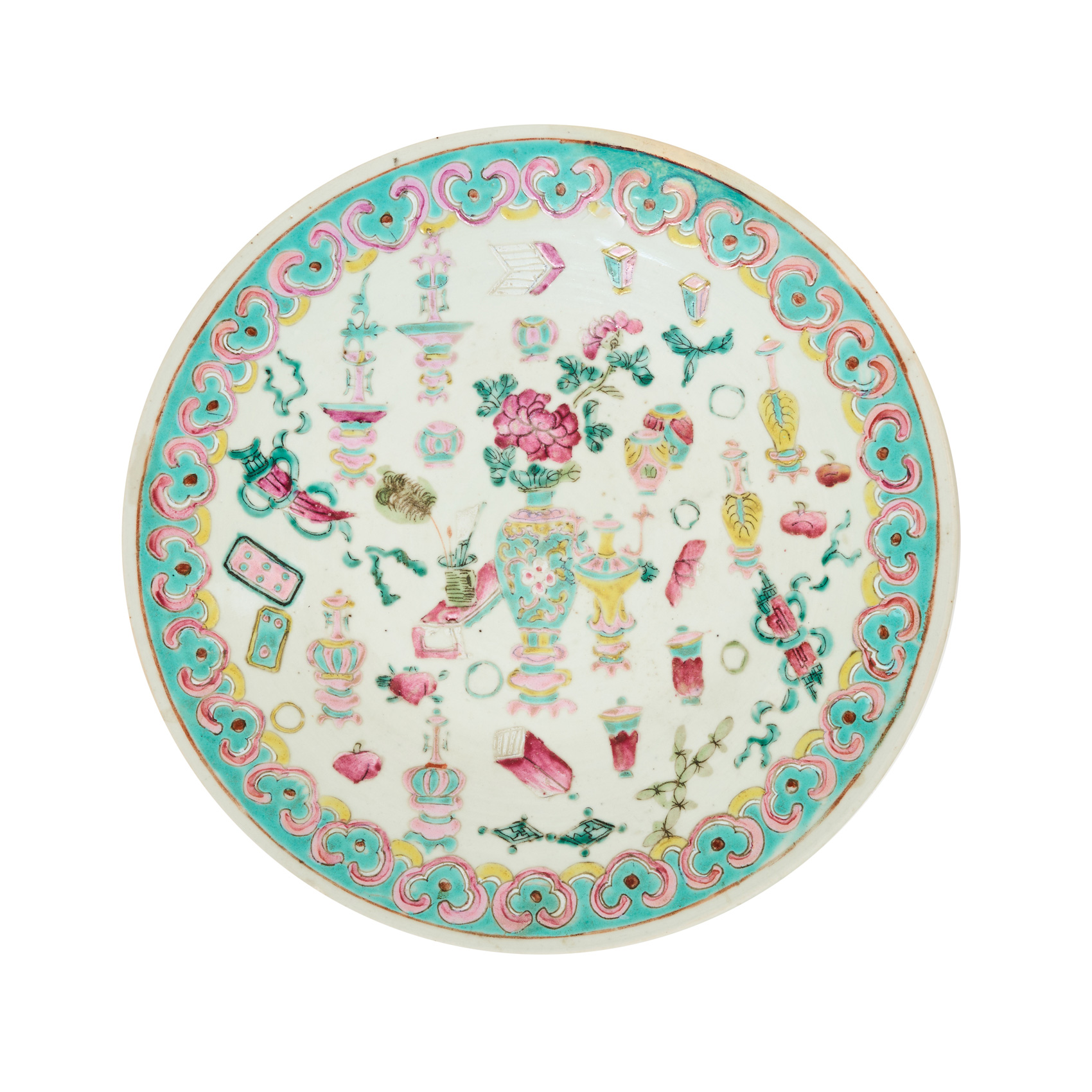 Plato chino en cerámica esmaltada Familia Rosa con motivos decorativos florales y jarrones, segunda mitad del s.XIX. Presenta cenefa vegetal en el alero.