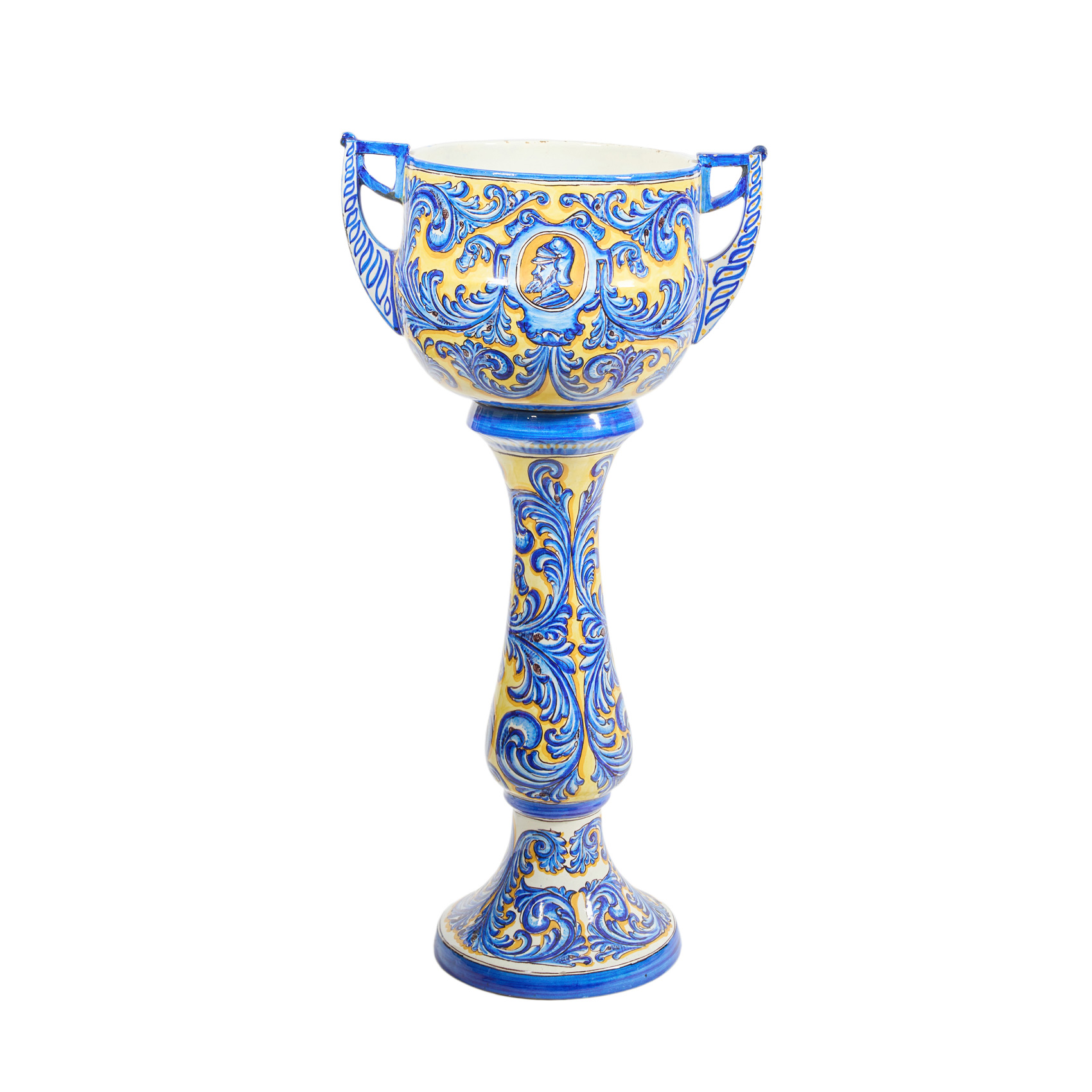 Jardinera con peana en cerámica española de Talavera esmaltada en tonalidades azul y amarilla con decoraciones vegetales y de medallones heráldicos, primera mitad del s.XX.