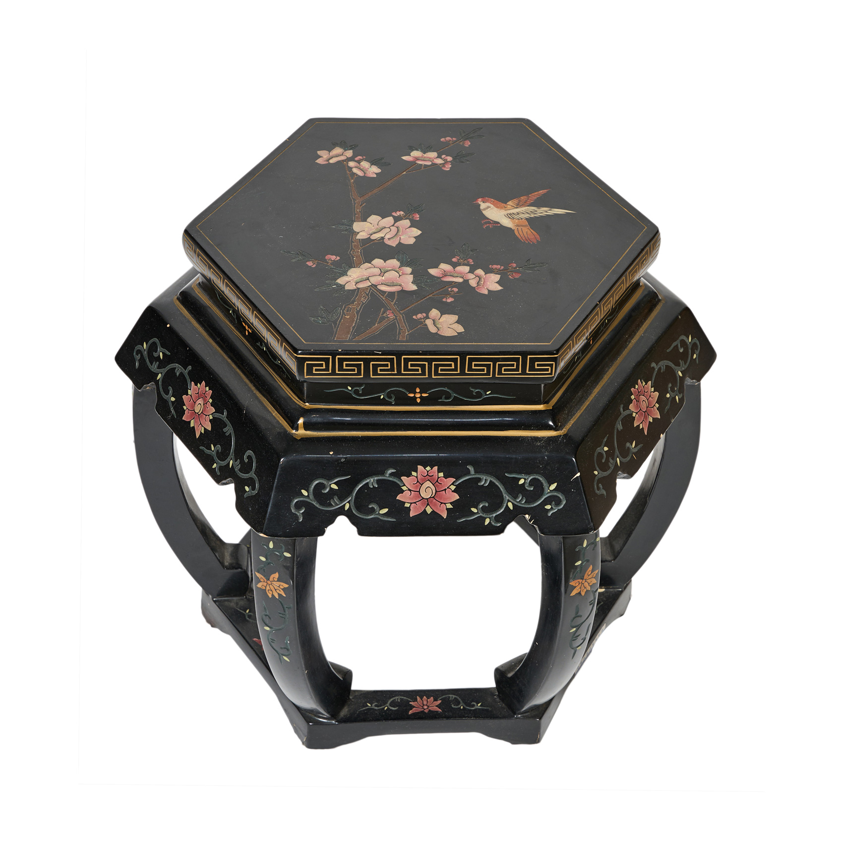 Mesa auxiliar china en madera lacada en negro, forma hexagonal y decoraciones de motivos florales y de aves, s.XX.