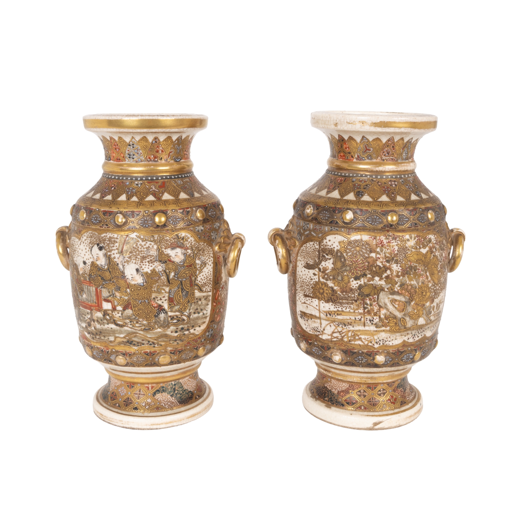 Pareja de jarrones en porcelana japonesa de Satsuma esmaltados con decoración de motivos paisajísticos y cortesanos en cartelas, ppios. del s.XX.