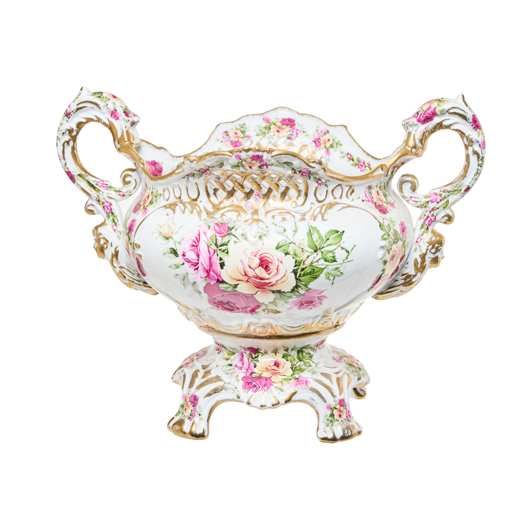 Centro en porcelana española esmaltada y calada con motivos decorativos florales y realces en dorado, s.XX. Marcas en la base.