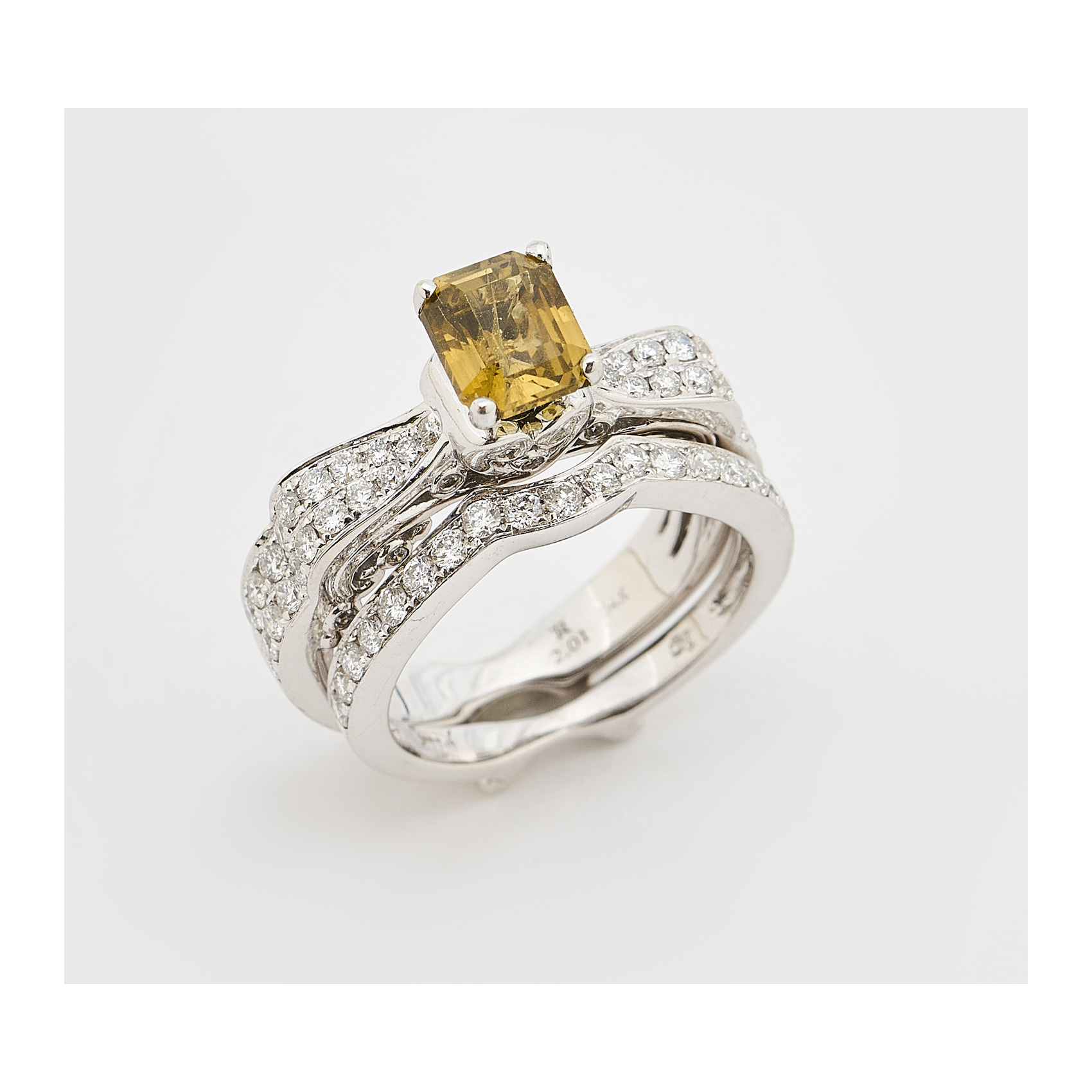 Dos sortijas adaptables en oro blanco, una con alejandrita deTanzania talla octogonal y otra diseño media alianza, ambas con diamantes talla brillante.