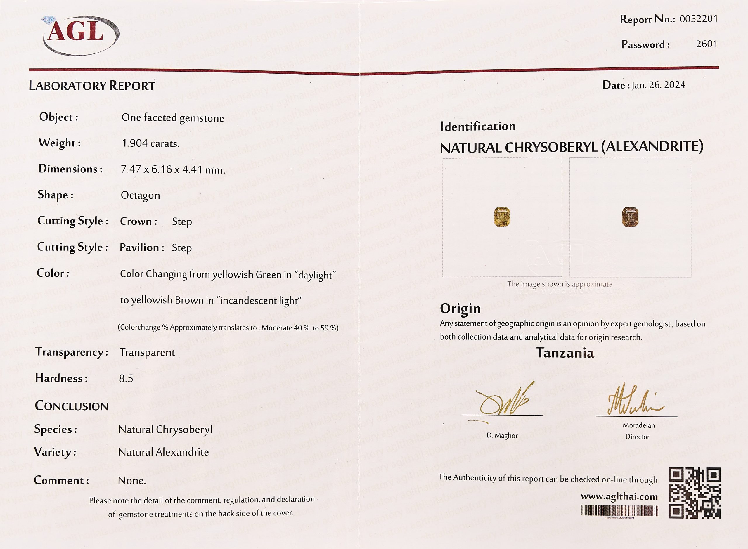 Adjunta certificado expedido por AGL Laboratory. Estimación:4900 – 5300€