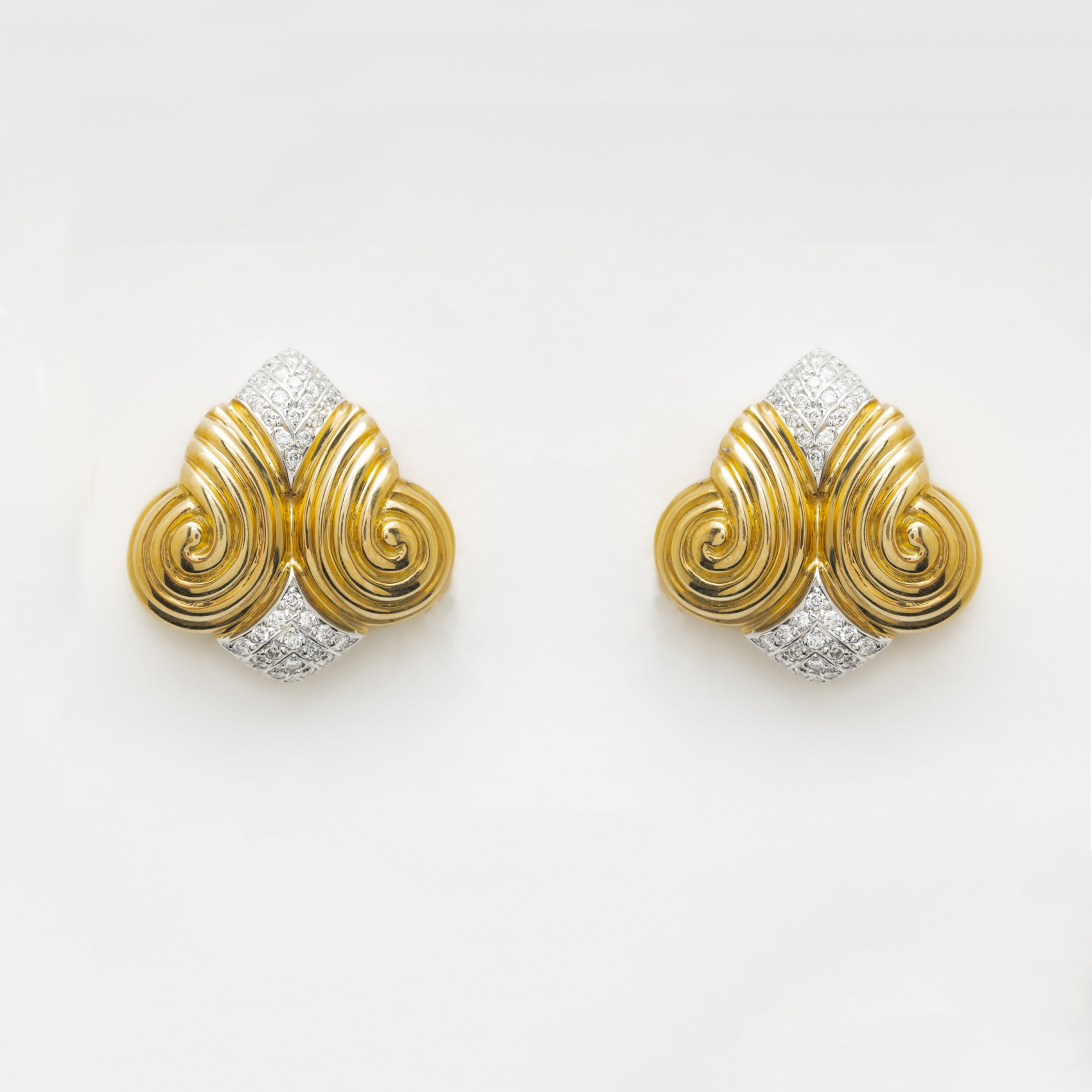 VASARI. Pendientes diseño gallonado en oro bicolor con motivos geométricos de diamantes talla brillante en ambos extremos.