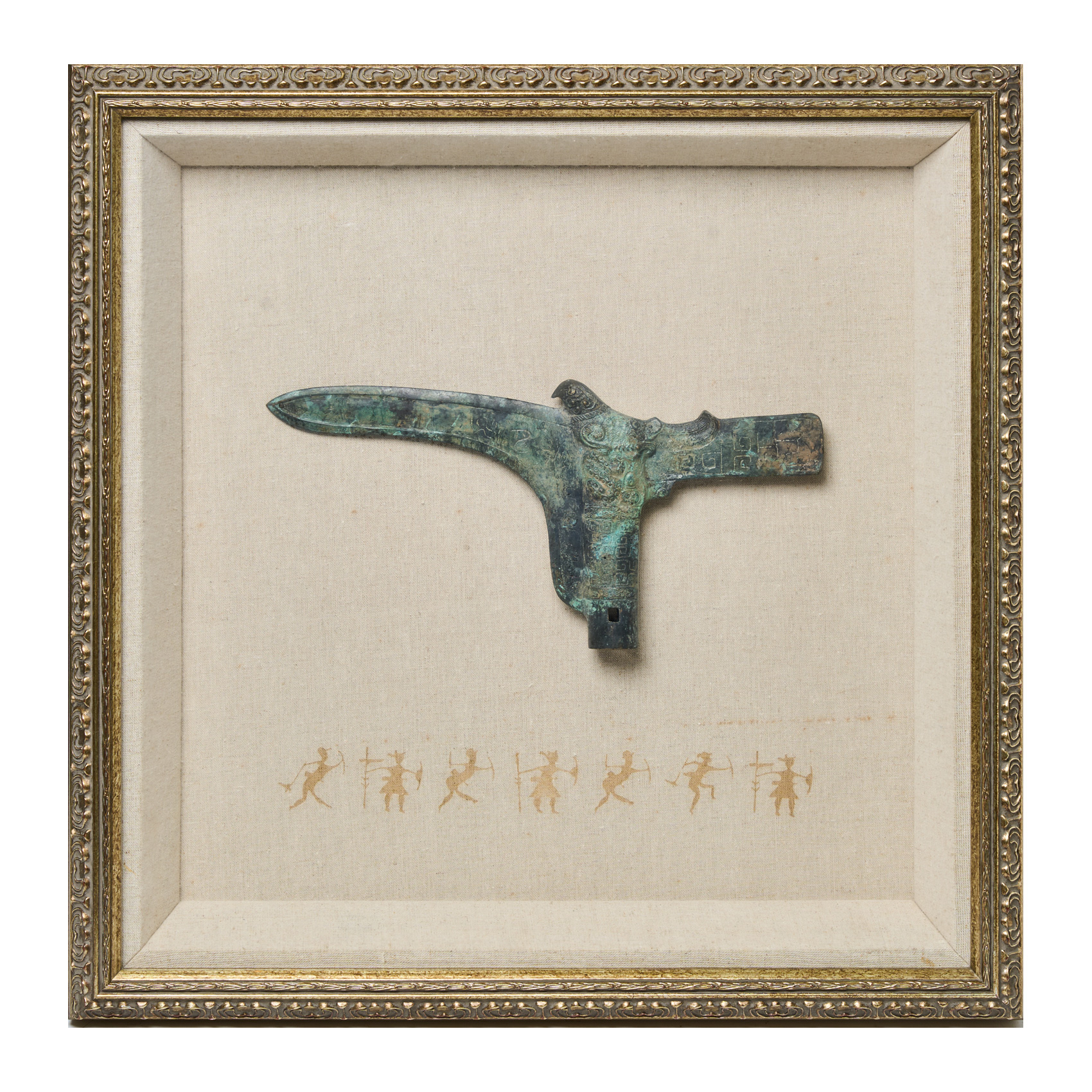 Ge o hacha ceremonial china en bronce patinado con decoraciones grabadas de motivos geométricos y zoomorfos, s.XX.