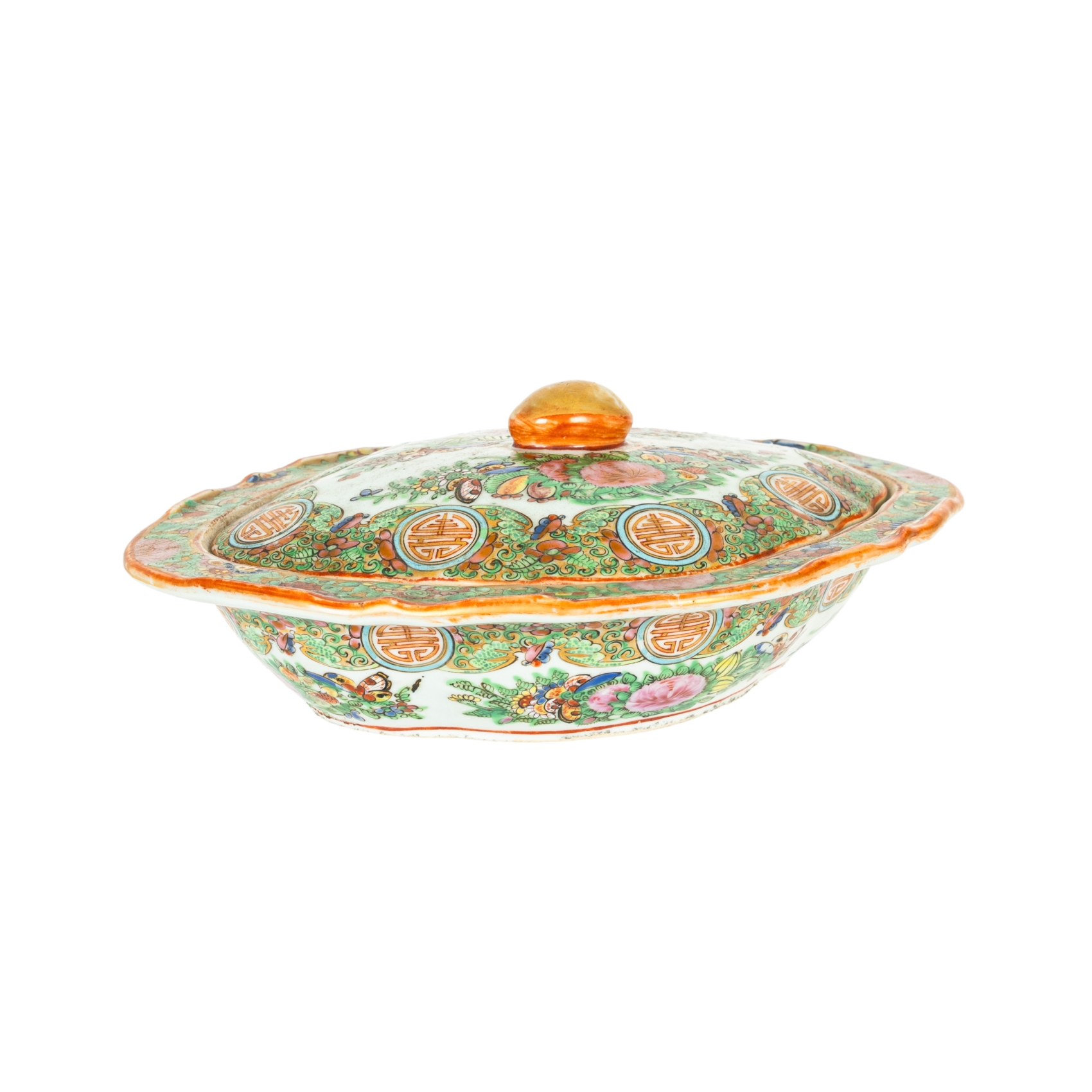 Fuente con tapa en porcelana china de Cantón, Familia Verde con decoraciones esmaltadas de motivos florales y de mariposas, fles. del s.XIX-ppios. del s.XX.