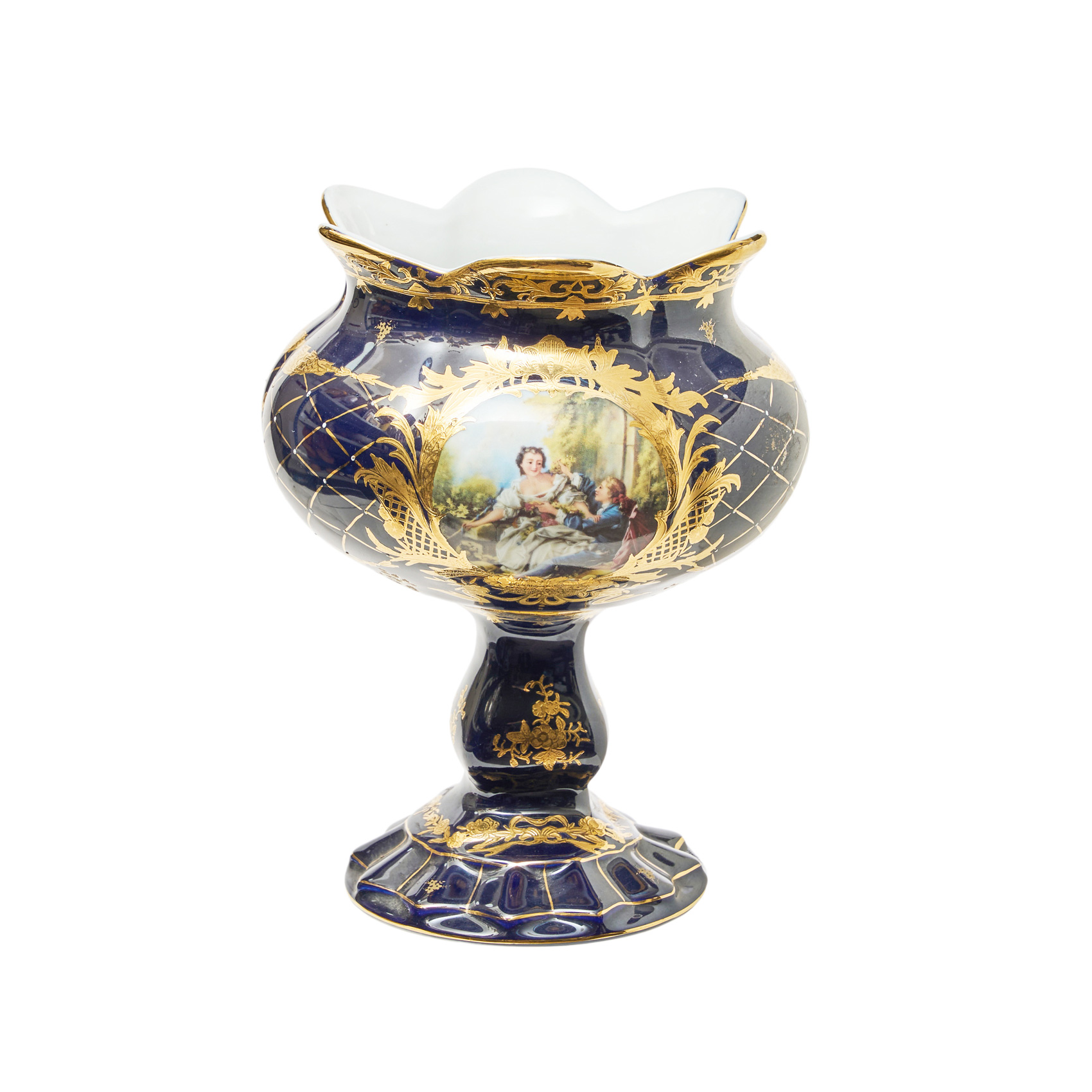 Centro en porcelana francesa Rétier con decoración de escenas galantes estampadas sobre fondo azul cobalto y fileteados la oro fino, c.1940. Marcas en la base.