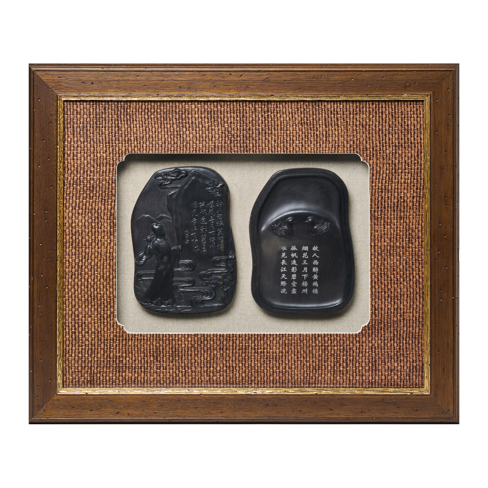 Chengni o Piedra de Tinta china con decoraciones de caracteres, aves y de personaje, s.XX. Enmarcada.