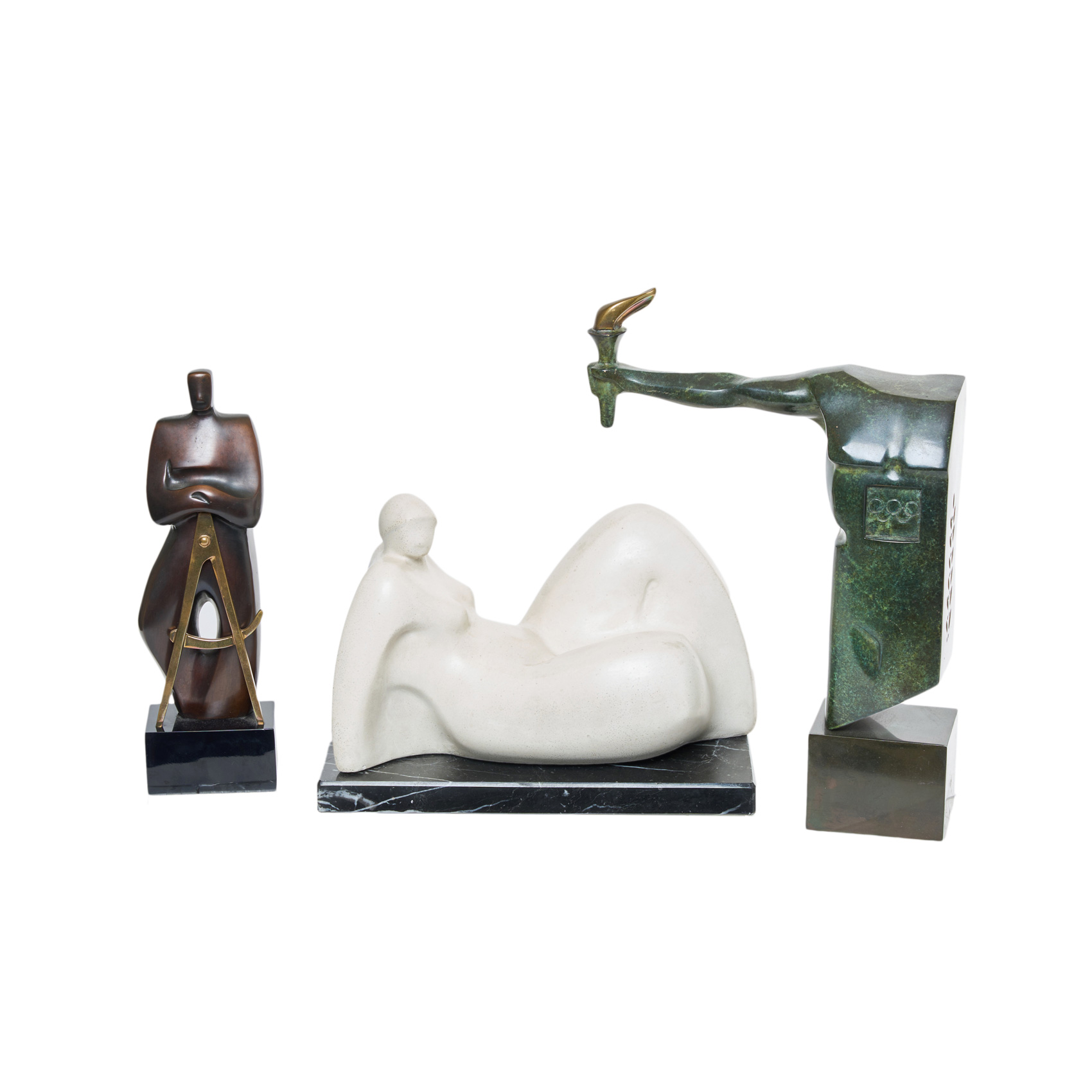 Lote de tres esculturas en bronce patinado, mármol verde veteado y piedra caliza. Firmadas todas y numeradas 38/50 y IX/X dos.