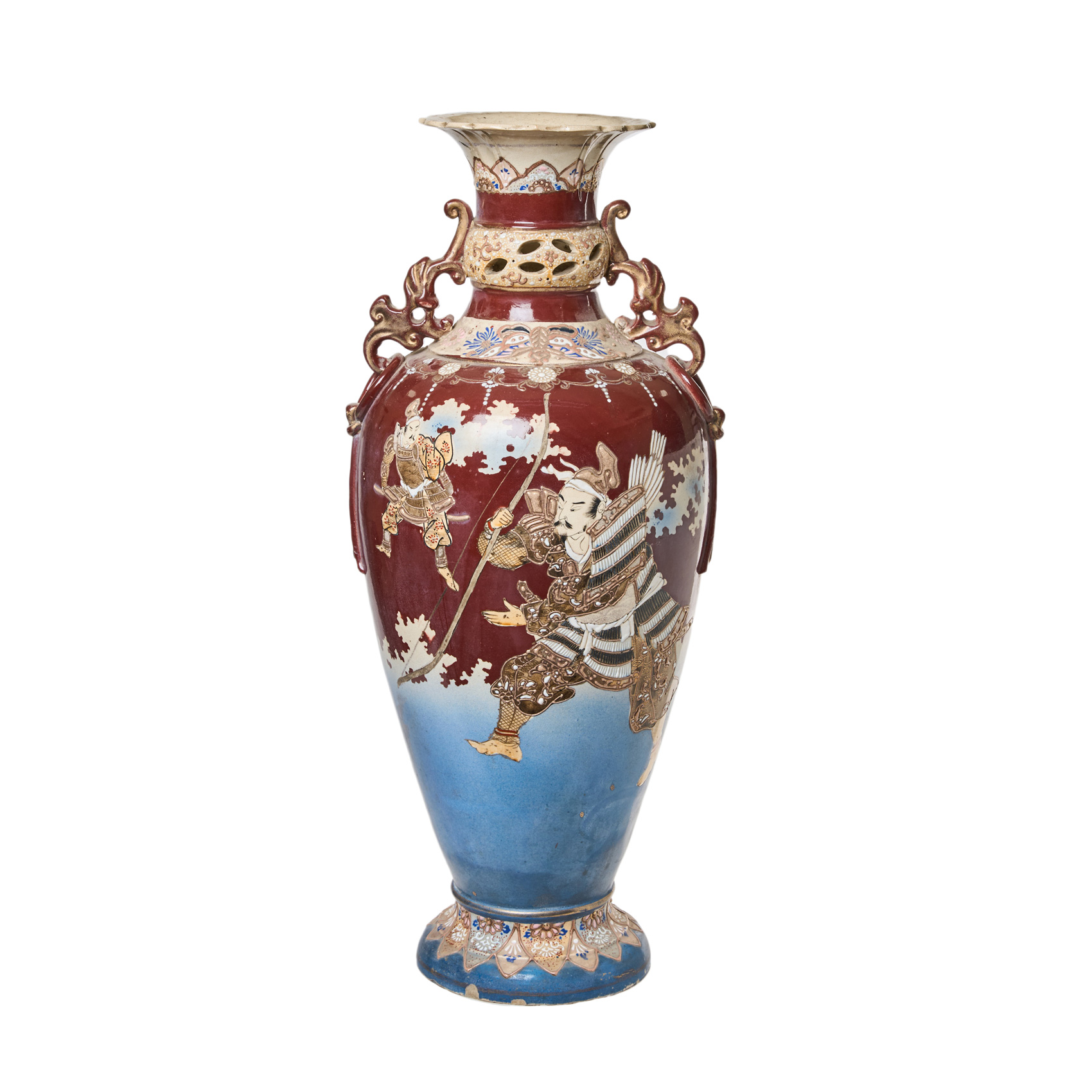 Jarrón en porcelana japonesa de Satsuma de cuello calado con decoración de guerreros samurais y fileteados al oro fino, mediados del s.XX.