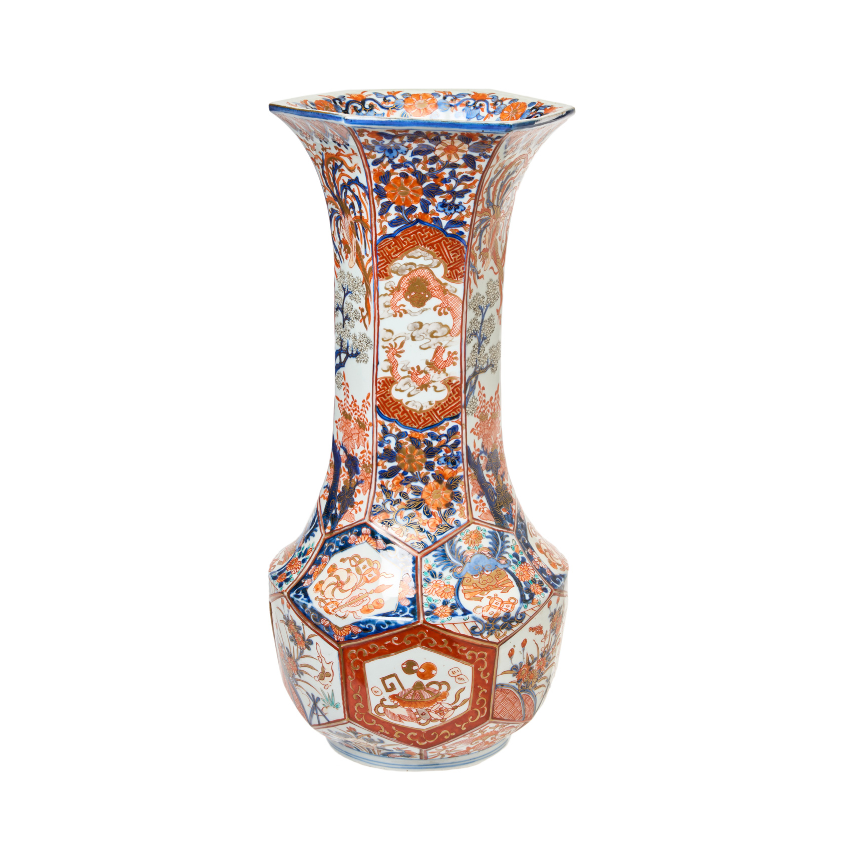 Jarrón en porcelana japonesa de Imari de cuello alto y perfil hexagonal decorado por motivos florales en cartelas, ppios. del s.XX.