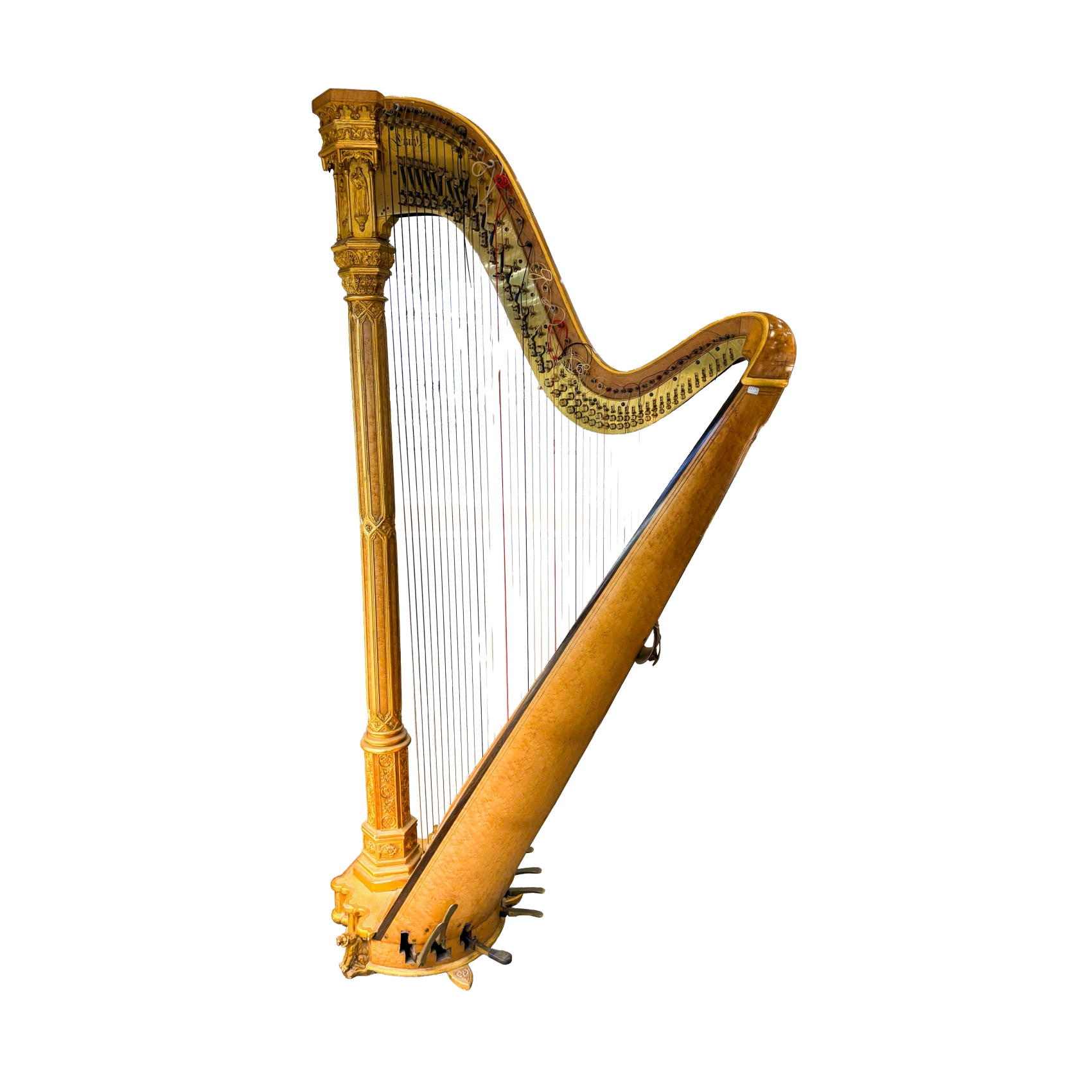 Arpa francesa Erard (París, 1752-1831) en madera tallada y dorada con columna y capitel de estilo neogótico de tipo arquitectónico, s.XIX.