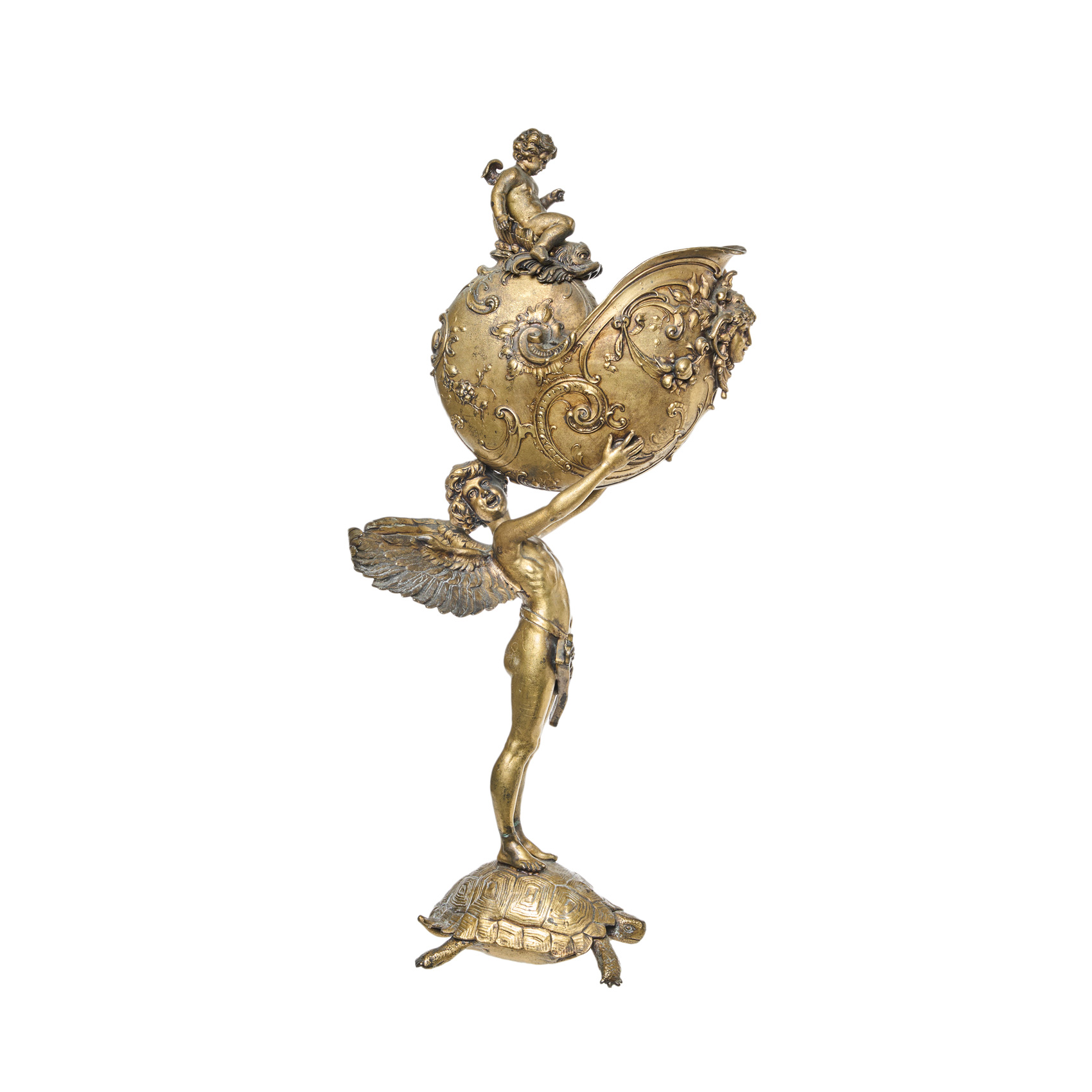 Centro en calamina dorada estilo renacentista con representación de Cupido sobre tortuga sosteniendo un nautilus rematado por querubin sobre delfín.