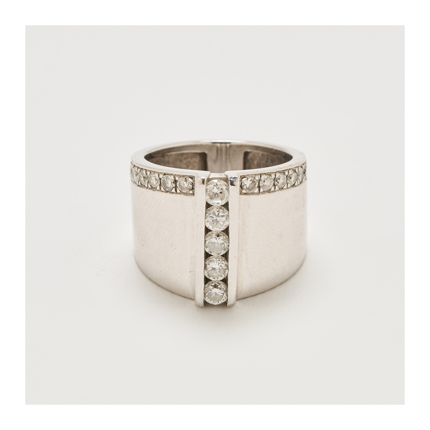 Sortija en oro blanco con centro y banda de diamantes talla brillante.