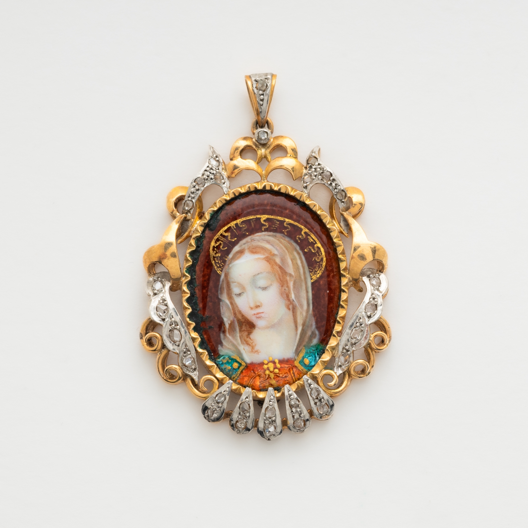 Medalla devocional en oro y vistas en platino con representación de Virgen en esmalte policromado, c.1940. El borde presenta un diseño calado con diamantes talla rosa, motivos vegetales y roleos.