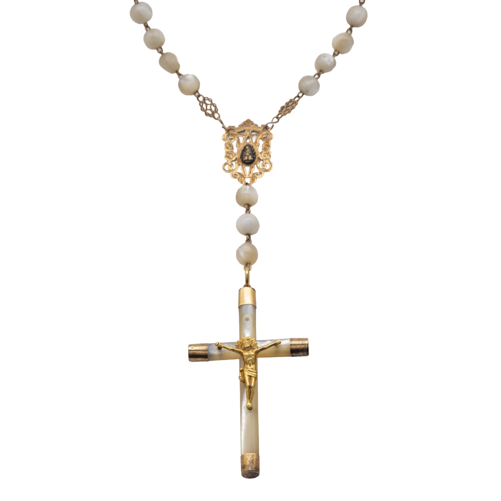Rosario con cruz y cuentas en nácar de 8 – 10 mm. y oro.
