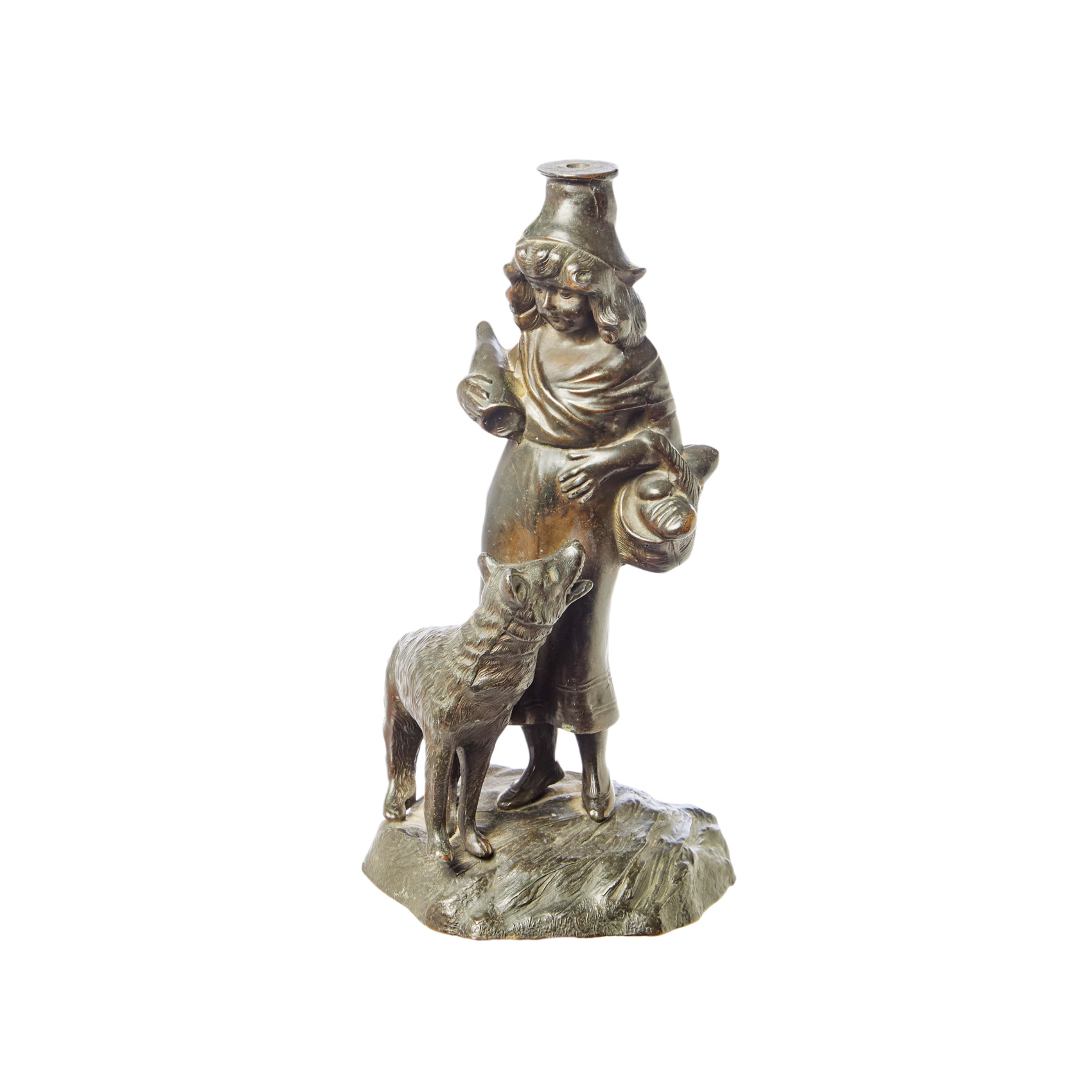 Escultura en calamina patinada. Preparada para sostener centro o lámpara.