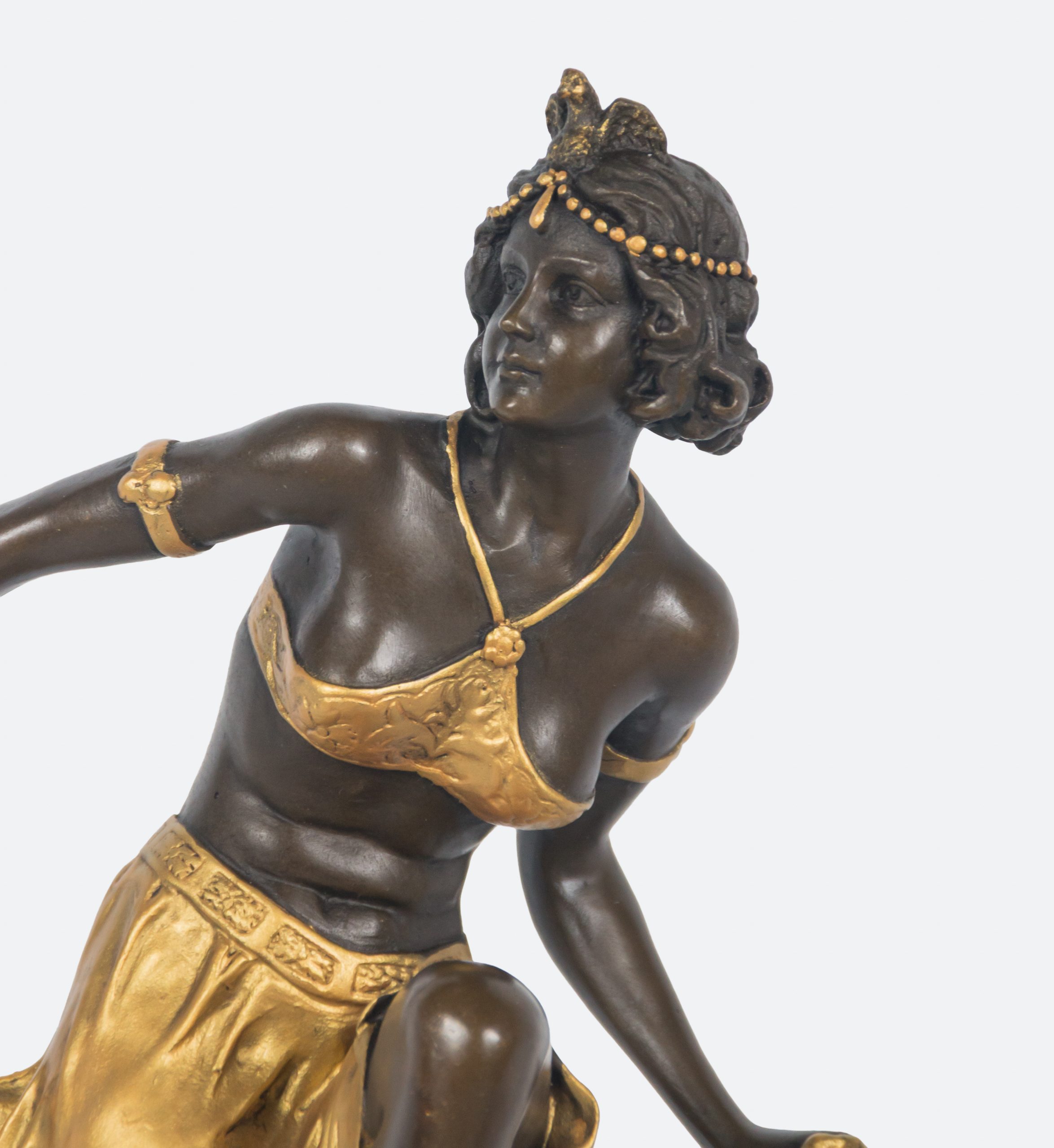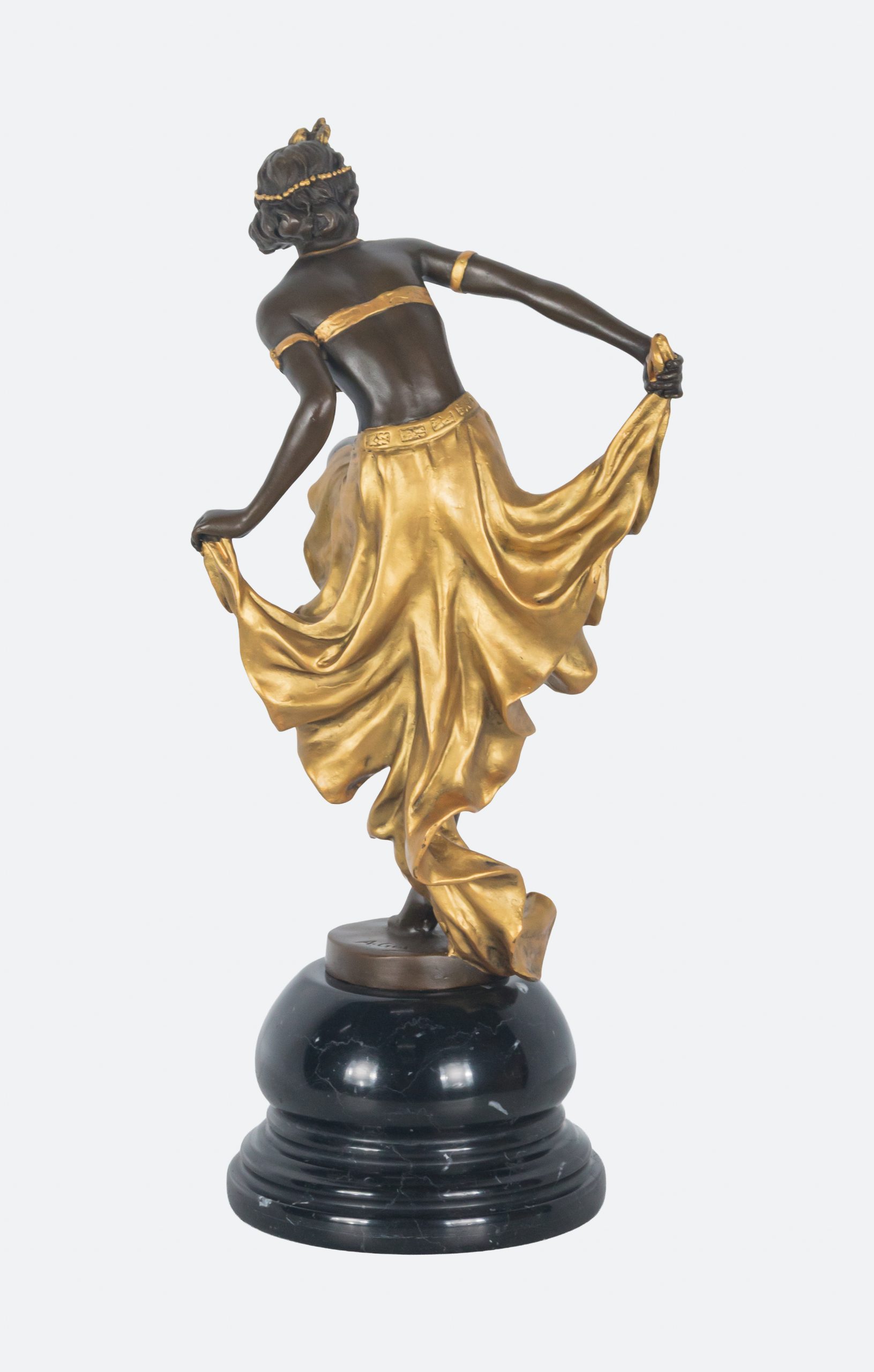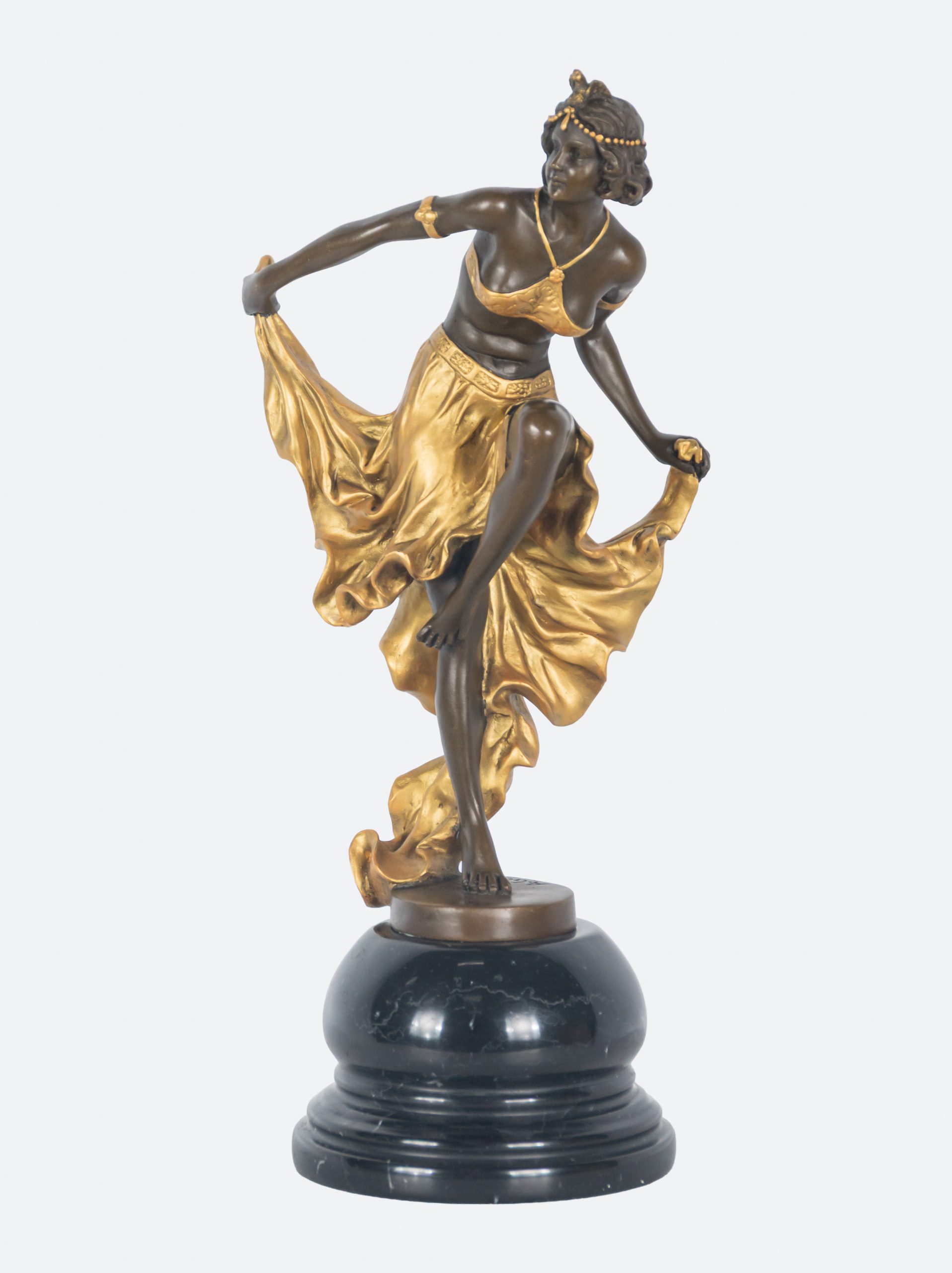 Escultura en bronce patinado y parcialmente dorado sobre peana en mármol negro. Firmada.