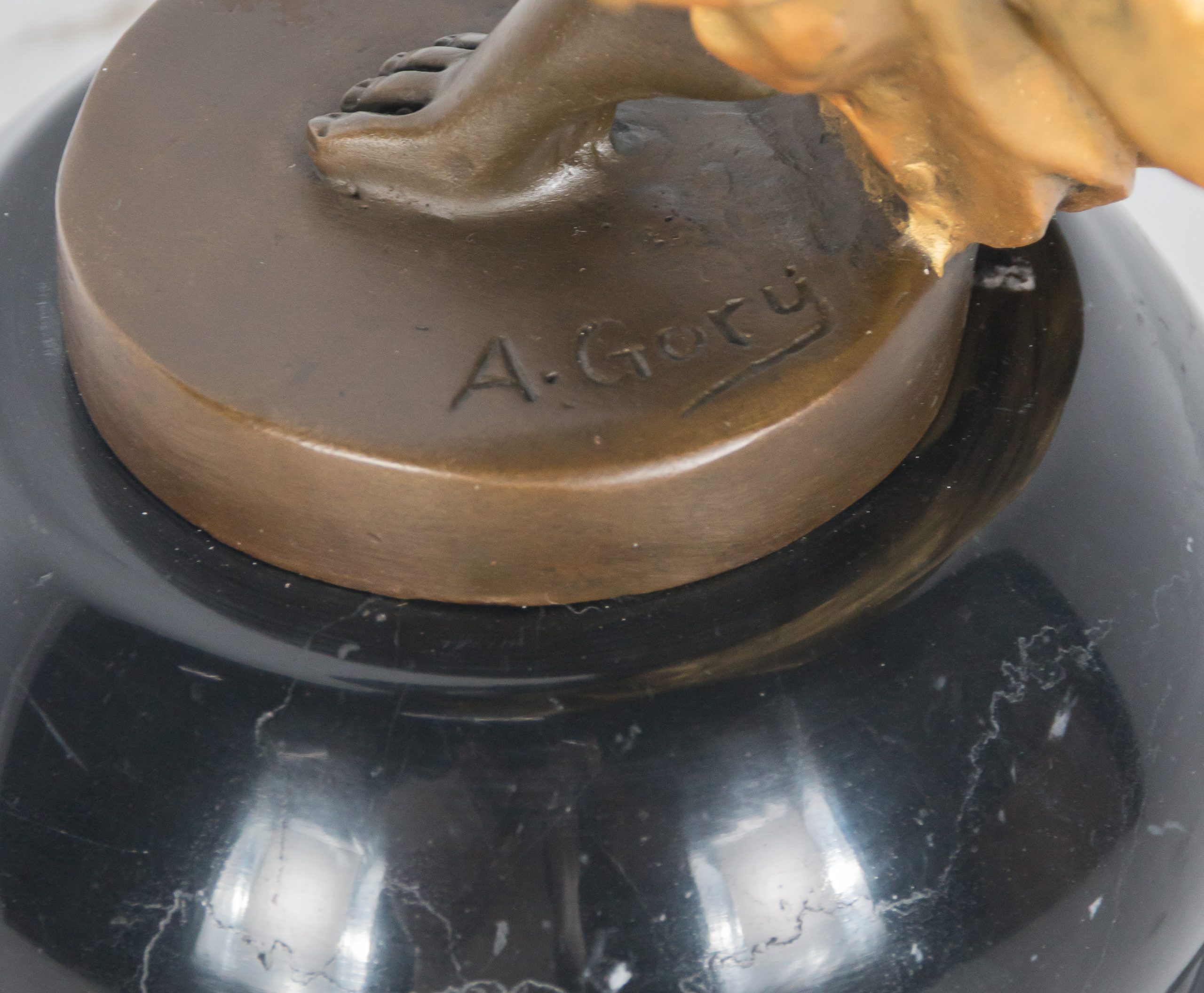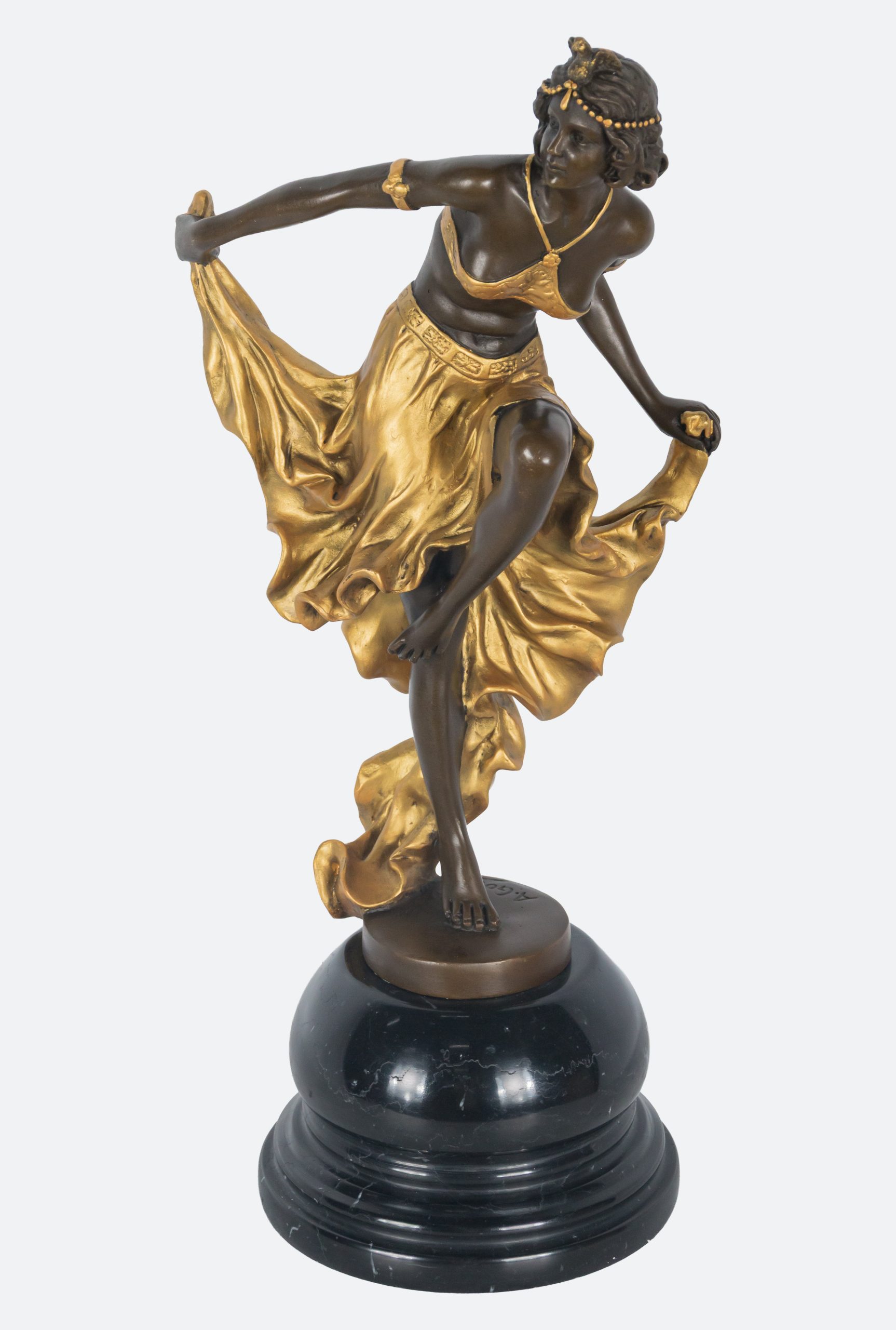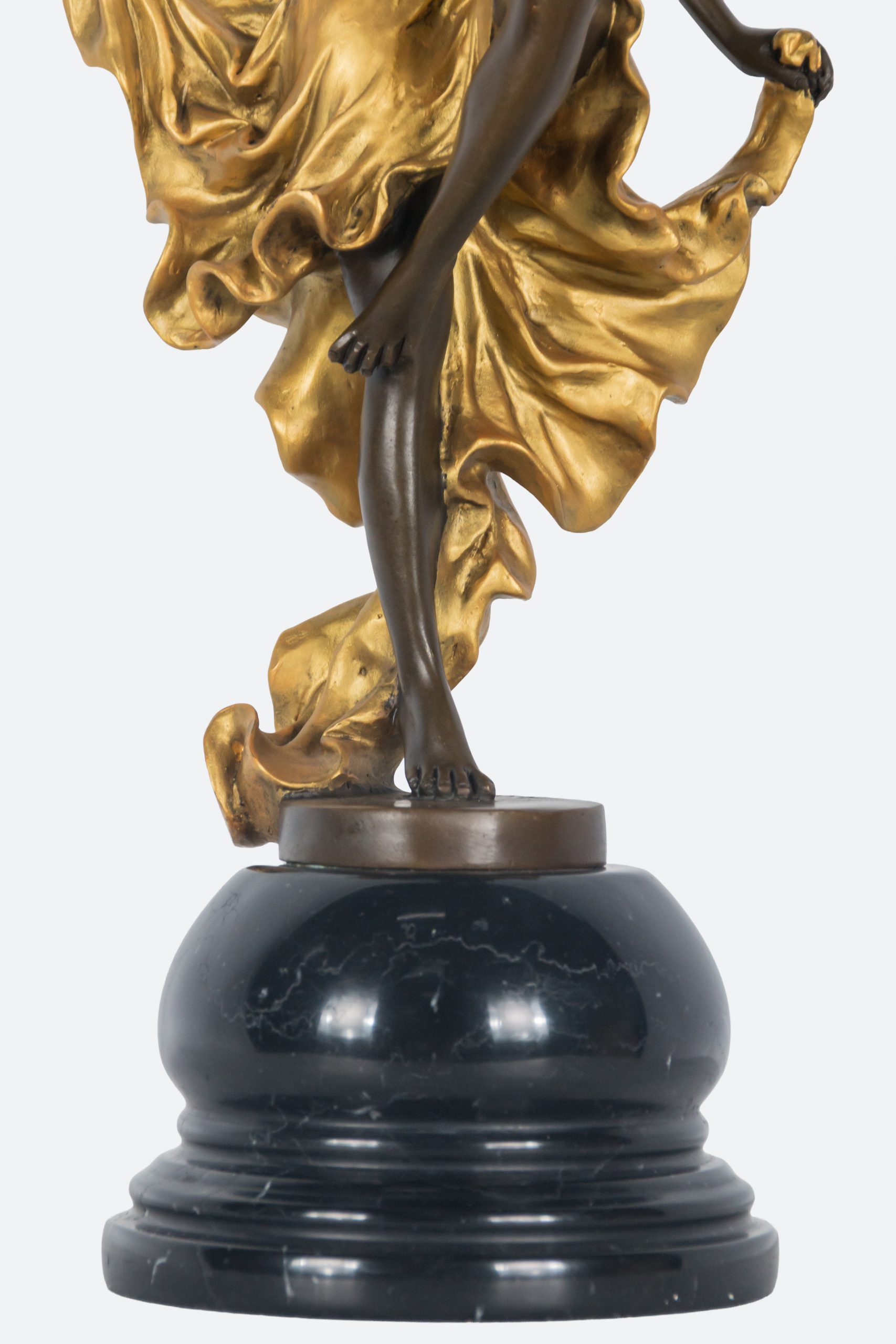 Escultura en bronce patinado y parcialmente dorado sobre peana en mármol negro. Firmada.
