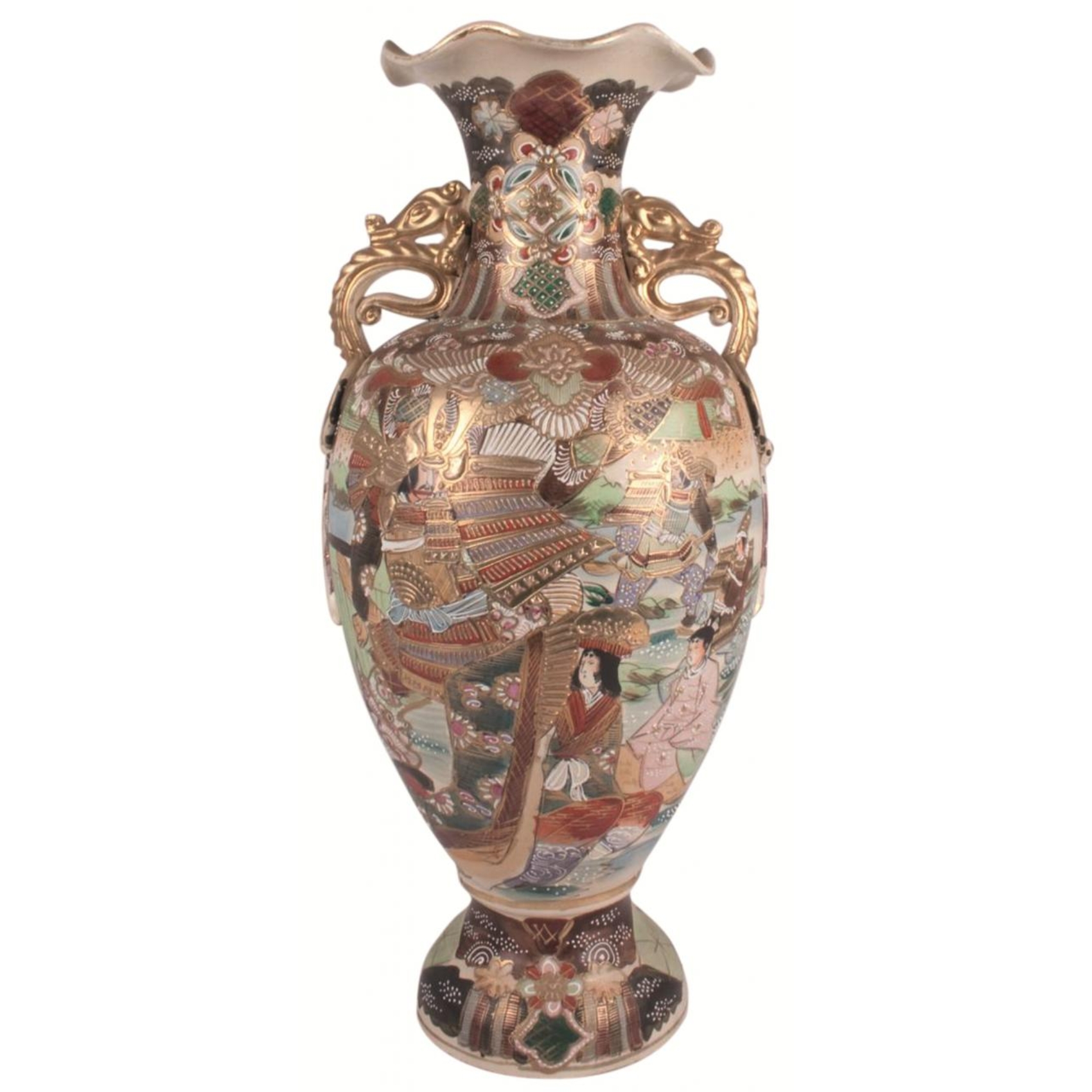 Jarrón en loza esmaltada japonesa con decoración estilo Satsuma y asas en dorado con forma de animal fantástico. Presenta sello en la base.