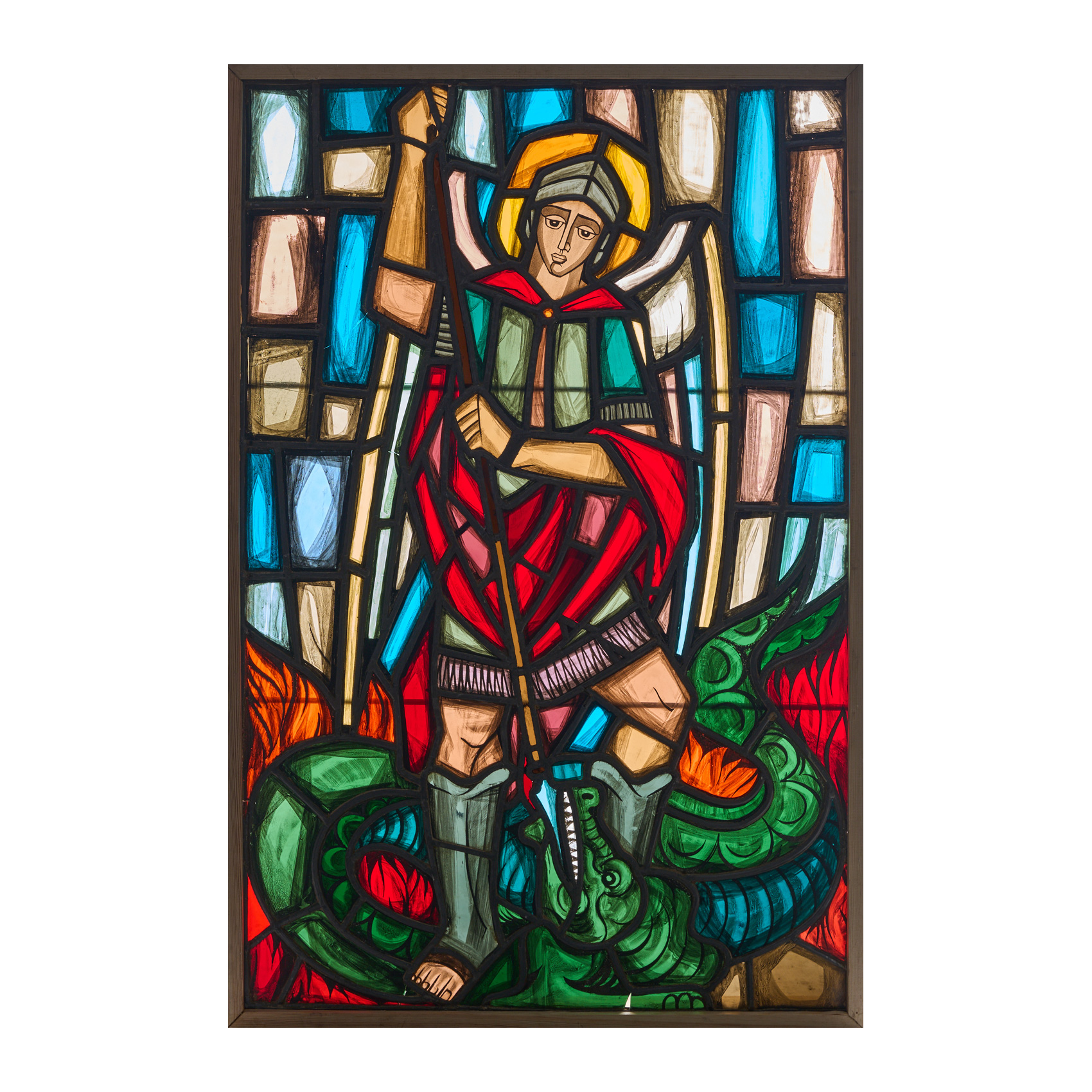 Vidriera en cristales policromos emplomados con representación del Arcángel San Miguel, c.1940.