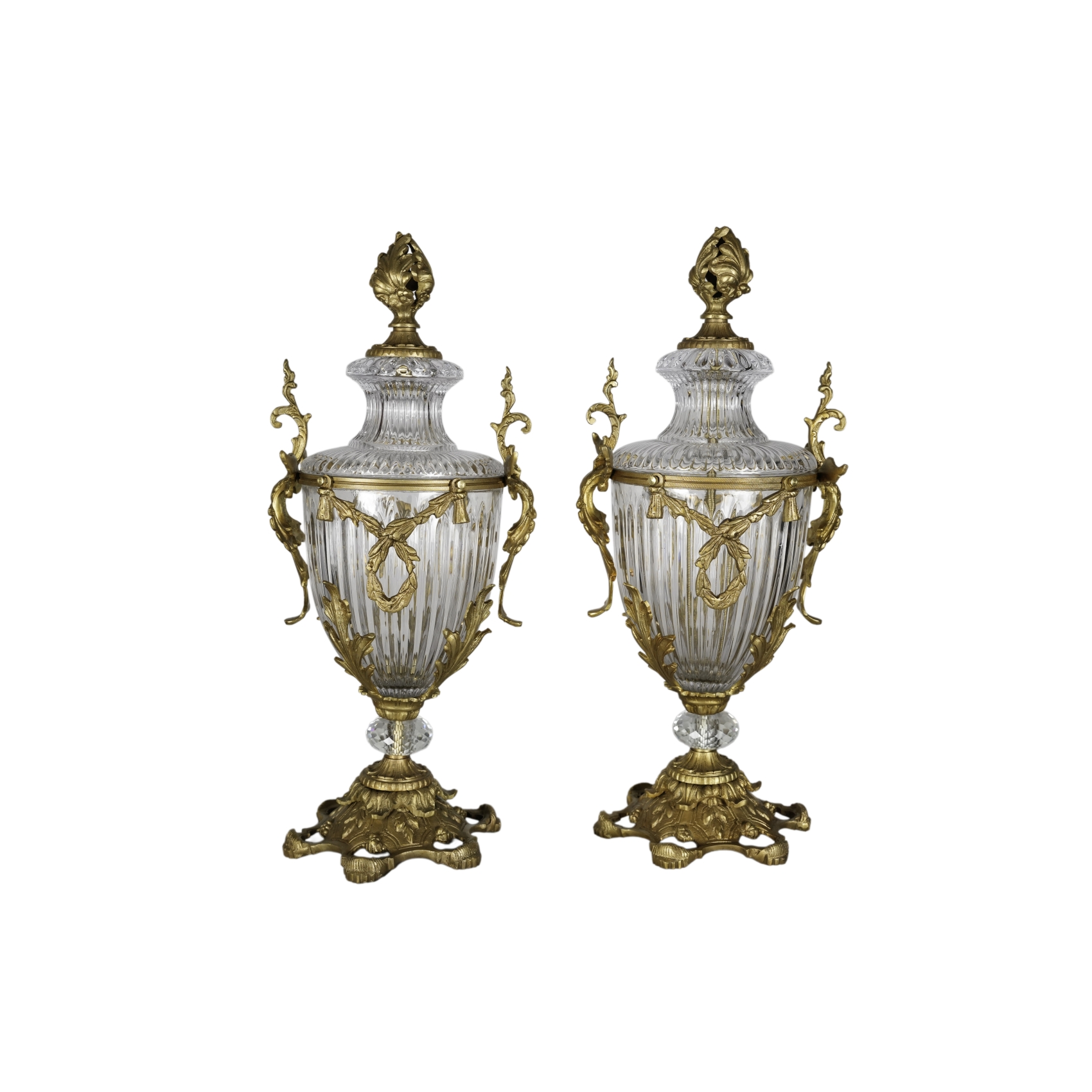 Pareja de copas francesas en cristal con motivos gallonados y montura en bronce dorado de motivos vegetales y roleos, s.XX.