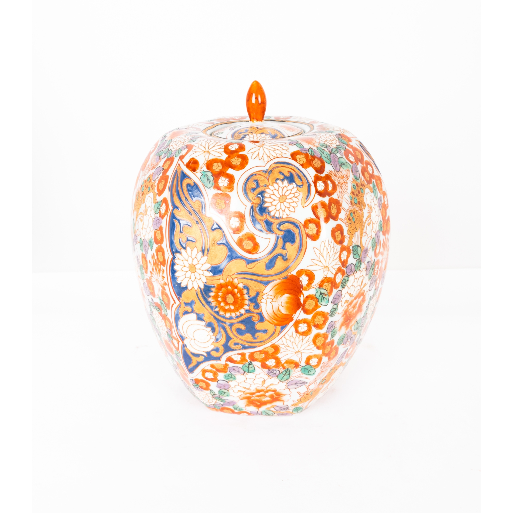 Tibor en porcelana japonesa de Imari con decoraciones de motivos florales, ppios. del s.XX. Apoya sobre peana en madera frutal tallada. Marcas en la base.